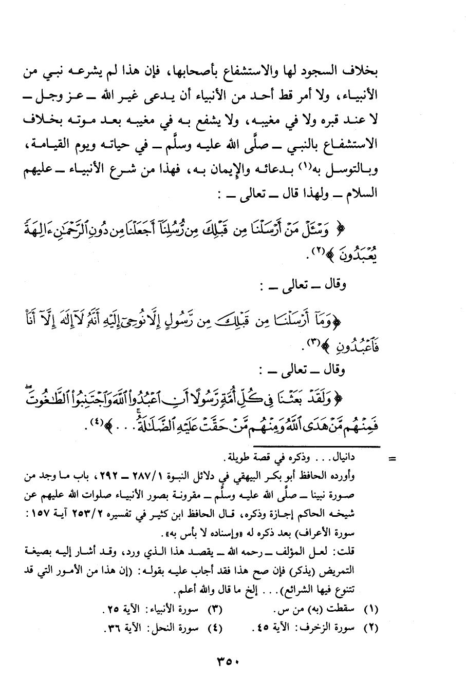 بِخِلَافِ السُّجُودِ لَهَا وَالِاسْتِشْفَاعِ بِأَصْحَابِهَا، فَإِنَّ هَذَا لَمْ يَشْرَعْهُ نَبِيٌّ مِنَ الْأَنْبِيَاءِ، وَلَا أَمَرَ قَطُّ أَحَدٌ مِنَ الْأَنْبِيَاءِ أَنْ يُدْعَى غَيْرُ اللَّهِ عَزَّ وَجَلَّ لَا عِنْدَ قَبْرِهِ، وَلَا فِي مَغِيبِهِ، وَلَا يُشْفَعُ بِهِ فِي مَغِيبِهِ بَعْدَ مَوْتِهِ، بِخِلَافِ الِاسْتِشْفَاعِ بِالنَّبِيِّ صَلَّى اللَّهُ عَلَيْهِ وَسَلَّمَ فِي حَيَاتِهِ وَيَوْمَ الْقِيَامَةِ، وَبِالتَّوَسُّلِ بِهِ بِدُعَائِهِ، وَالْإِيمَانِ بِهِ، فَهَذَا مِنْ شَرْعِ الْأَنْبِيَاءِ عَلَيْهِمُ السَّلَامُ، وَلِهَذَا قَالَ تَعَالَى: {وَاسْأَلْ مَنْ أَرْسَلْنَا مِنْ قَبْلِكَ مِنْ رُسُلِنَا أَجَعَلْنَا مِنْ دُونِ الرَّحْمَنِ آلِهَةً يُعْبَدُونَ} [الزخرف: 45] .
