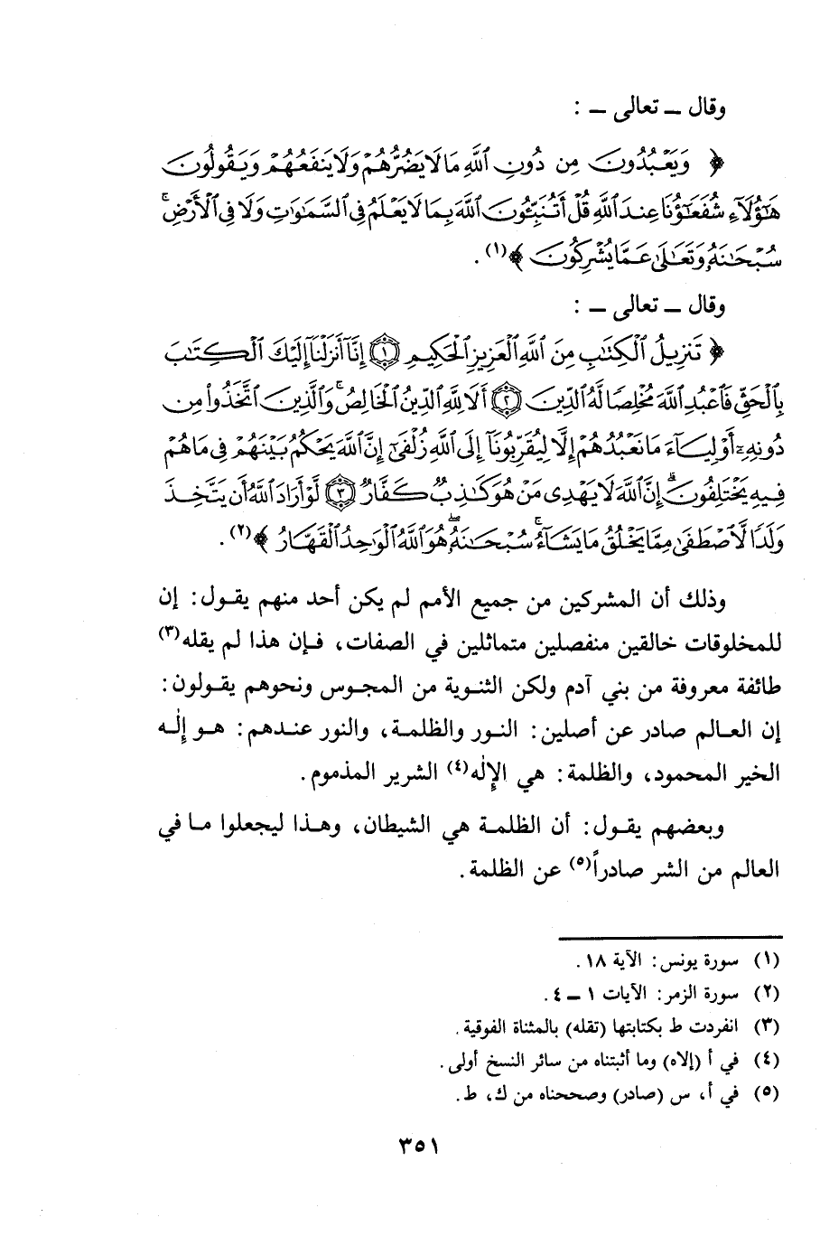 وَذَلِكَ أَنَّ الْمُشْرِكِينَ مِنْ جَمِيعِ الْأُمَمِ لَمْ يَكُنْ أَحَدٌ مِنْهُمْ يَقُولُ إِنَّ لِلْمَخْلُوقَاتِ خَالِقِينَ مُنْفَصِلِينَ مُتَمَاثِلِينَ فِي الصِّفَاتِ، فَإِنَّ هَذَا لَمْ يَقُلْهُ طَائِفَةٌ مَعْرُوفَةٌ مِنْ بَنِي آدَمَ، وَلَكِنَّ الثَّنَوِيَّةَ مِنَ الْمَجُوسِ وَنَحْوِهِمْ يَقُولُونَ: إِنَّ الْعَالَمَ صَادِرٌ عَنْ أَصْلَيْنِ: النُّورِ وَالظُّلْمَةِ، وَالنُّورُ عِنْدَهُمْ هُوَ إِلَهُ الْخَيْرِ الْمَحْمُودُ، وَالظُّلْمَةُ هِيَ الْإِلَهُ الشِّرِّيرُ الْمَذْمُومُ.