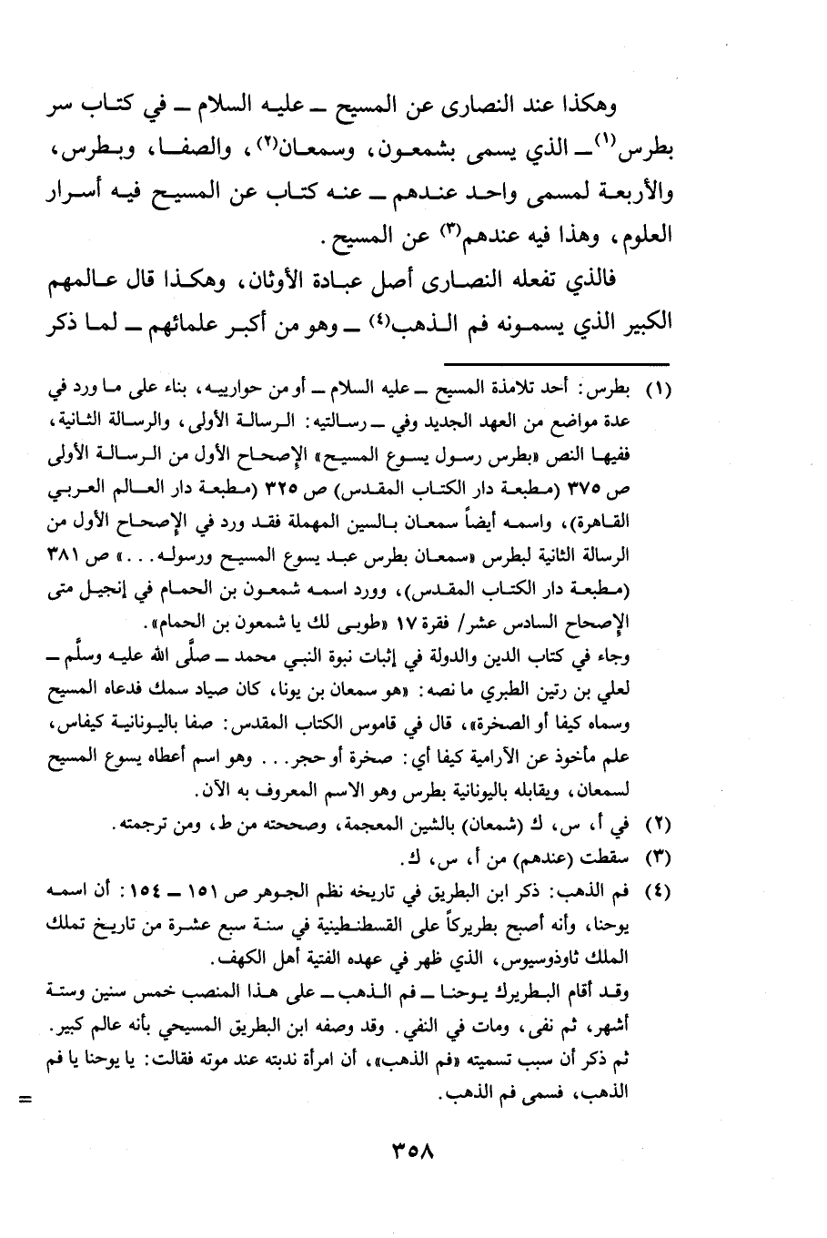 وَهَكَذَا عِنْدَ النَّصَارَى عَنِ الْمَسِيحِ عَلَيْهِ السَّلَامُ فِي كِتَابِ سِرِّ بُطْرُسَ الَّذِي يُسَمَّى بِشَمْعُونَ، وَسَمْعَانَ، وَالصَّفَا، وَبُطْرُسَ، وَالْأَرْبَعَةُ لِمُسَمًّى وَاحِدٍ، عِنْدَهُمْ عَنْهُ كِتَابٌ عَنِ الْمَسِيحِ فِيهِ أَسْرَارُ الْعُلُومِ، وَهَذَا فِيهِ عِنْدَهُمْ عَنِ الْمَسِيحِ