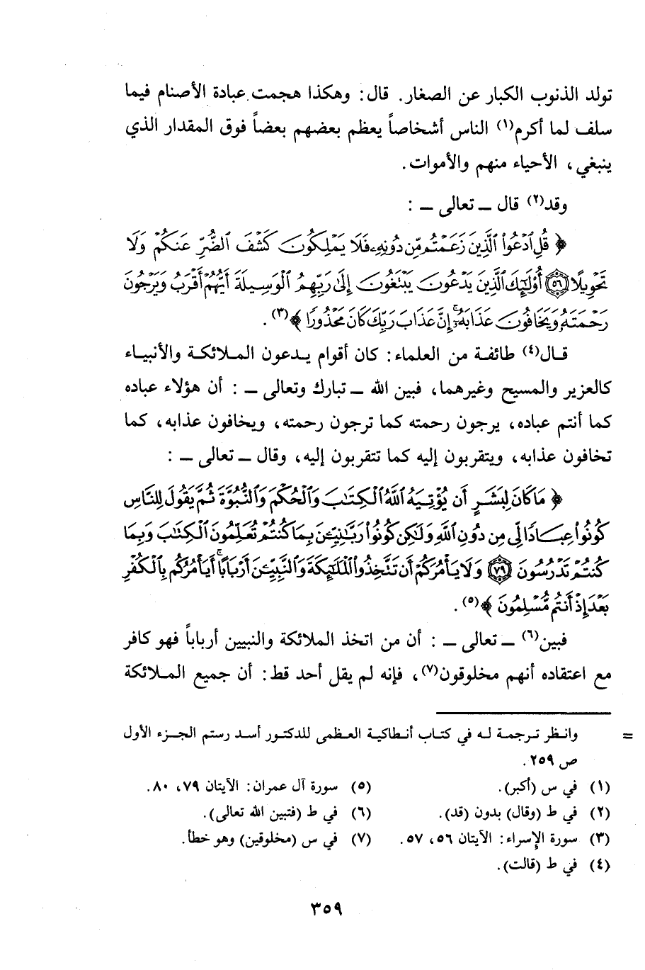 تَوَلُّدَ الذُّنُوبِ الْكِبَارِ عَنِ الصِّغَارِ. قَالَ: وَهَكَذَا هَجَمَتْ عِبَادَةُ الْأَصْنَامِ فِيمَا سَلَفَ لَمَّا أَكْرَمَ النَّاسُ أَشْخَاصًا يُعَظِّمُ بَعْضُهُمْ بَعْضًا فَوْقَ الْمِقْدَارِ الَّذِي يَنْبَغِي، الْأَحْيَاءَ مِنْهُمْ وَالْأَمْوَاتَ.