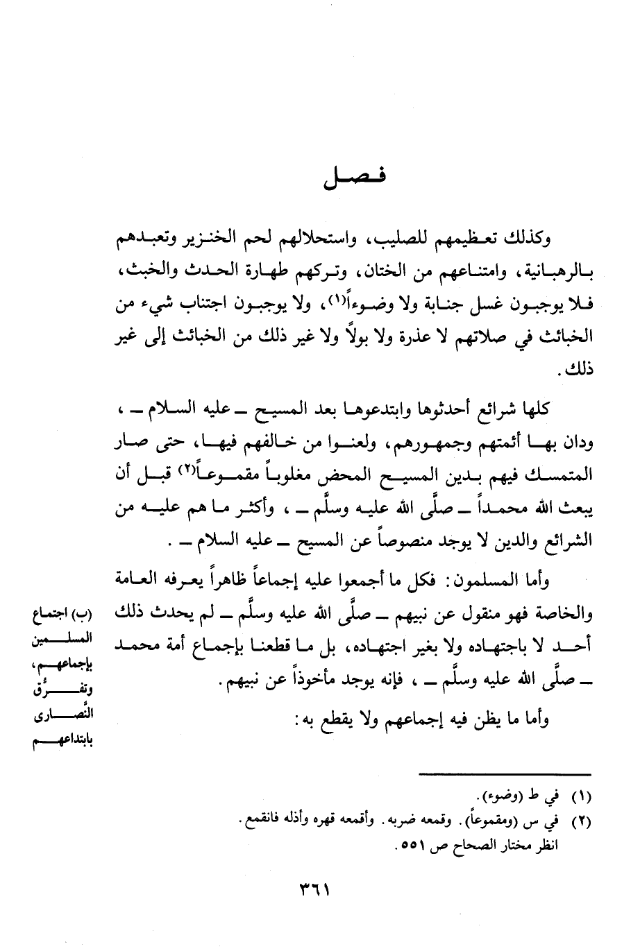 كُلُّهَا شَرَائِعُ أَحْدَثُوهَا وَابْتَدَعُوهَا بَعْدَ الْمَسِيحِ عَلَيْهِ السَّلَامُ، وَدَانَ بِهَا أَئِمَّتُهُمْ وَجُمْهُورُهُمْ، وَلَعَنُوا مَنْ خَالَفَهُمْ فِيهَا، حَتَّى صَارَ الْمُتَمَسِّكُ فِيهِمْ بِدِينِ الْمَسِيحِ الْمَحْضِ مَغْلُوبًا مَقْمُوعًا قَبْلَ أَنْ يَبْعَثَ اللَّهُ مُحَمَّدًا صَلَّى اللَّهُ عَلَيْهِ وَسَلَّمَ، وَأَكْثَرُ مَا هُمْ عَلَيْهِ مِنَ الشَّرَائِعِ وَالدِّينِ لَا يُوجَدُ مَنْصُوصًا عَنِ الْمَسِيحِ عَلَيْهِ السَّلَامُ.