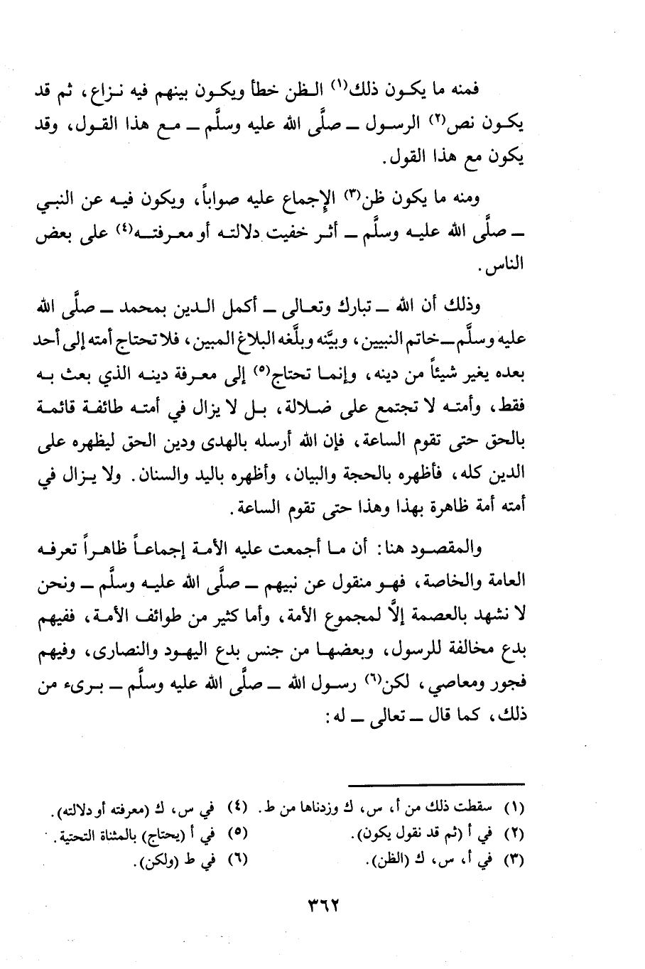 وَذَلِكَ أَنَّ اللَّهَ تَبَارَكَ وَتَعَالَى أَكْمَلَ الدِّينَ بِمُحَمَّدٍ صَلَّى اللَّهُ عَلَيْهِ وَسَلَّمَ خَاتَمِ النَّبِيِّينَ، وَبَيَّنَهُ، وَبَلَّغَهُ الْبَلَاغَ الْمُبِينَ، فَلَا تَحْتَاجُ أُمَّتُهُ إِلَى أَحَدٍ بَعْدَهُ يُغَيِّرُ شَيْئًا مِنْ دِينِهِ، وَإِنَّمَا تَحْتَاجُ إِلَى مَعْرِفَةِ دِينِهِ الَّذِي بُعِثَ بِهِ فَقَطْ، وَأُمَّتُهُ لَا تَجْتَمِعُ عَلَى ضَلَالَةٍ، بَلْ لَا يَزَالُ فِي أُمَّتِهِ طَائِفَةٌ قَائِمَةٌ بِالْحَقِّ، حَتَّى تَقُومَ السَّاعَةُ، فَإِنَّ اللَّهَ أَرْسَلَهُ بِالْهُدَى وَدِينِ الْحَقِّ لِيُظْهِرَهُ عَلَى الدِّينِ كُلِّهِ، فَأَظْهَرَهُ بِالْحُجَّةِ وَالْبَيَانِ، وَأَظْهَرَهُ بِالْيَدِ وَالسِّنَانِ، وَلَا يَزَالُ فِي أُمَّتِهِ أُمَّةٌ ظَاهِرَةٌ بِهَذَا وَهَذَا حَتَّى تَقُومَ السَّاعَةُ.