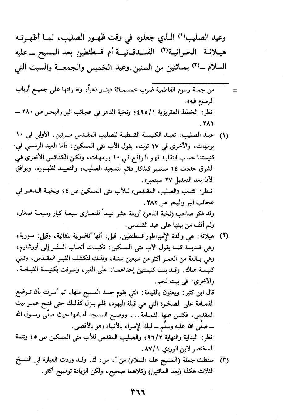 وَعِيدِ الصَّلِيبِ الَّذِي جَعَلُوهُ فِي وَقْتِ ظُهُورِ الصَّلِيبِ، لَمَّا أَظْهَرَتْهُ هِيلَانَةُ الْحَرَّانِيَّةُ الْفُنْدُقَانِيَّةُ أُمُّ قُسْطَنْطِينَ بَعْدَ الْمَسِيحِ عَلَيْهِ السَّلَامُ بِمِائَتَيْنِ مِنَ السِّنِينَ، وَعِيدِ الْخَمِيسِ وَالْجُمُعَةِ وَالسَّبْتِ الَّتِي