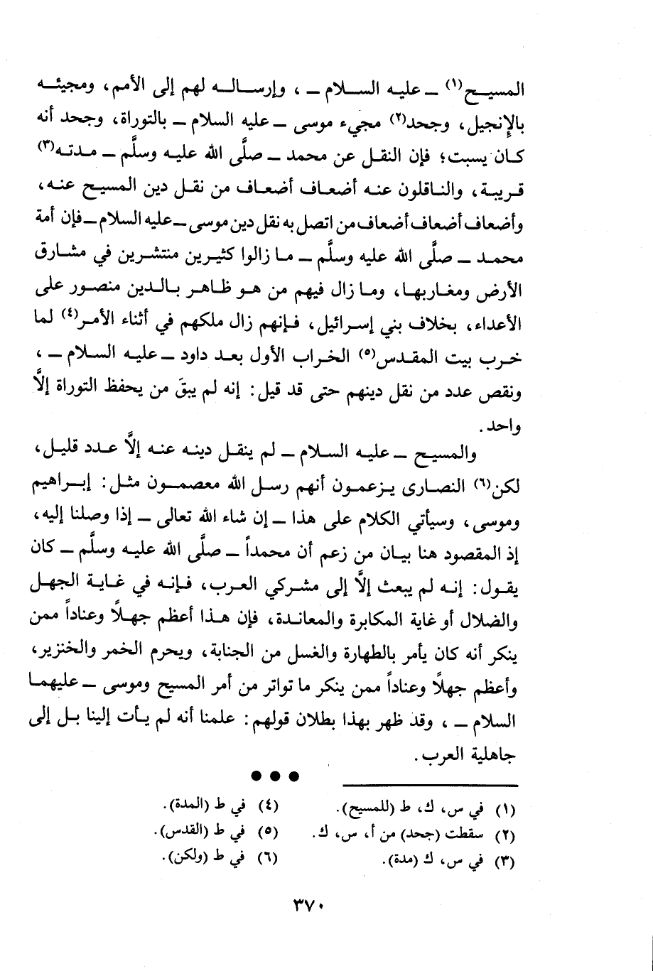وَالْمَسِيحُ عَلَيْهِ السَّلَامُ لَمْ يَنْقُلْ دِينَهُ عَنْهُ إِلَّا عَدَدٌ قَلِيلٌ لَكِنَّ النَّصَارَى يَزْعُمُونَ أَنَّهُمْ رُسُلُ اللَّهِ مُعْصَمُونَ مِثْلَ: إِبْرَاهِيمَ وَمُوسَى، وَسَيَأْتِي الْكَلَامُ عَلَى هَذَا إِنْ شَاءَ اللَّهُ تَعَالَى إِذَا وَصَلْنَا إِلَيْهِ، إِذِ الْمَقْصُودُ هُنَا بَيَانُ مَنْ زَعَمَ أَنَّ مُحَمَّدًا صَلَّى اللَّهُ عَلَيْهِ وَسَلَّمَ كَانَ يَقُولُ: إِنَّهُ لَمْ يُبْعَثْ إِلَّا إِلَى مُشْرِكِي الْعَرَبِ، فَإِنَّهُ فِي غَايَةِ الْجَهْلِ وَالضَّلَالِ أَوْ غَايَةِ الْمُكَابَرَةِ وَالْمُعَانَدَةِ، فَإِنَّ هَذَا أَعْظَمُ جَهْلًا وَعِنَادًا مِمَّنْ يُنْكِرُ أَنَّهُ كَانَ يَأْمُرُ بِالطَّهَارَةِ وَالْغُسْلِ مِنَ الْجَنَابَةِ، وَيُحَرِّمُ الْخَمْرَ وَالْخِنْزِيرَ، وَأَعْظَمُ جَهْلًا وَعِنَادًا مِمَّنْ يُنْكِرُ مَا تَوَاتَرَ مِنْ أَمْرِ الْمَسِيحِ، وَمُوسَى عَلَيْهِمَا السَّلَامُ، وَقَدْ ظَهَرَ بِهَذَا بُطْلَانُ قَوْلِهِمْ: عَلِمْنَا أَنَّهُ لَمْ يَأْتِ إِلَيْنَا بَلْ إِلَى جَاهِلِيَّةِ الْعَرَبِ.