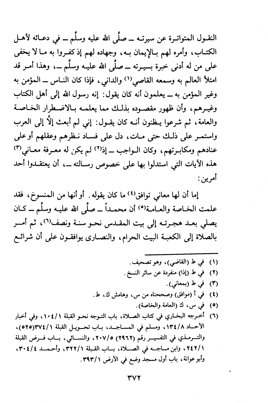 إِمَّا أَنَّ لَهَا مَعَانِيَ تُوَافُقُ مَا كَانَ يَقُولُهُ، أَوْ أَنَّهَا مِنَ الْمَنْسُوخِ فَقَدْ عَلِمَتِ الْخَاصَّةُ وَالْعَامَّةُ: أَنَّ مُحَمَّدًا صَلَّى اللَّهُ عَلَيْهِ وَسَلَّمَ كَانَ يُصَلِّي بَعْدَ هِجْرَتِهِ إِلَى بَيْتِ الْمَقْدِسِ نَحْوَ سَنَةٍ وَنِصْفٍ، ثُمَّ أُمِرَ بِالصَّلَاةِ إِلَى الْكَعْبَةِ الْبَيْتِ الْحَرَامِ، وَالنَّصَارَى يُوَافِقُونَ عَلَى أَنَّ شَرَائِعَ