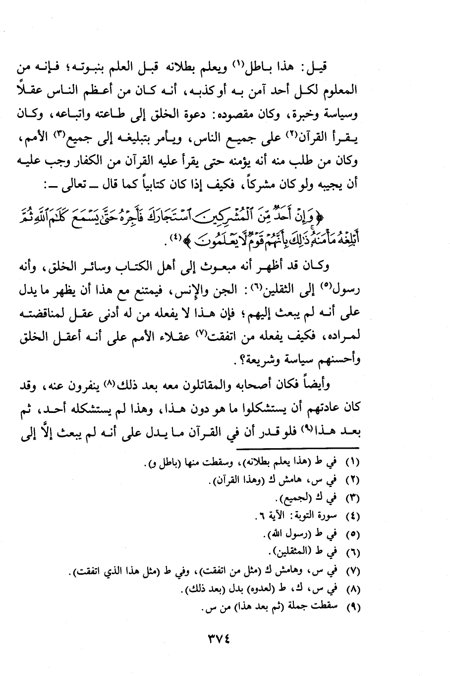 قِيلَ: هَذَا بَاطِلٌ، وَيُعْلَمُ بُطْلَانُهُ قَبْلَ الْعِلْمِ بِنُبُوَّتِهِ ; فَإِنَّهُ مِنَ الْمَعْلُومِ لِكُلِّ أَحَدٍ آمَنَ بِهِ، أَوْ كَذَّبَهُ أَنَّهُ كَانَ مِنْ أَعْظَمِ النَّاسِ عَقْلًا وَسِيَاسَةً وَخِبْرَةً، وَكَانَ مَقْصُودُهُ دَعْوَةَ الْخَلْقِ إِلَى طَاعَتِهِ وَاتِّبَاعِهِ، وَكَانَ يَقْرَأُ الْقُرْآنَ عَلَى جَمِيعِ النَّاسِ، وَيَأْمُرُ بِتَبْلِيغِهِ إِلَى جَمِيعِ الْأُمَمِ، وَكَانَ مَنْ طَلَبَ مِنْهُ أَنْ يُؤَمِّنَهُ حَتَّى يَقْرَأَ عَلَيْهِ الْقُرْآنَ مِنَ الْكُفَّارِ وَجَبَ عَلَيْهِ أَنْ يُجِيبَهُ وَلَوْ كَانَ مُشْرِكًا، فَكَيْفَ إِذَا كَانَ كِتَابِيًّا؟ كَمَا قَالَ تَعَالَى: {وَإِنْ أَحَدٌ مِنَ الْمُشْرِكِينَ اسْتَجَارَكَ فَأَجِرْهُ حَتَّى يَسْمَعَ كَلَامَ اللَّهِ ثُمَّ أَبْلِغْهُ مَأْمَنَهُ ذَلِكَ بِأَنَّهُمْ قَوْمٌ لَا يَعْلَمُونَ} [التوبة: 6] .