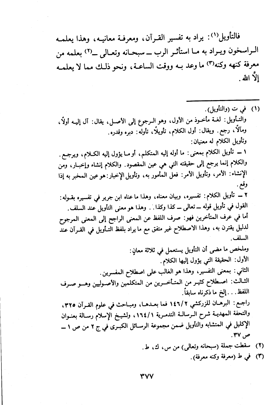 فَالتَّأْوِيلُ: يُرَادُ بِهِ تَفْسِيرُ الْقُرْآنِ، وَمَعْرِفَةُ مَعَانِيهِ، وَهَذَا يَعْلَمُهُ الرَّاسِخُونَ، وَيُرَادُ بِهِ مَا اسْتَأْثَرَ الرَّبُّ سُبْحَانَهُ وَتَعَالَى بِعِلْمِهِ مِنْ مَعْرِفَةِ كُنْهِهِ وَكُنْهِ مَا وَعَدَ بِهِ وَوَقْتِ السَّاعَةِ، وَنَحْوِ ذَلِكَ مِمَّا لَا يَعْلَمُهُ إِلَّا اللَّهُ.