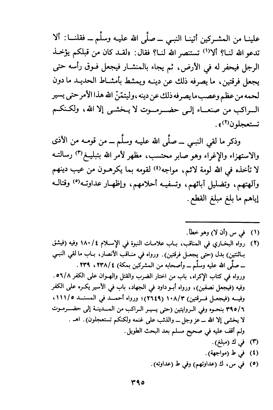 عَلَيْنَا مِنَ الْمُشْرِكِينَ أَتَيْنَا النَّبِيَّ صَلَّى اللَّهُ عَلَيْهِ وَسَلَّمَ فَقُلْنَا: أَلَا تَدْعُو اللَّهَ لَنَا؟ أَلَا تَسْتَنْصِرُ اللَّهَ لَنَا؟ فَقَالَ: لَقَدْ كَانَ مَنْ قَبْلَكُمْ يُؤْخَذُ الرَّجُلُ فَيُحْفَرُ لَهُ فِي الْأَرْضِ، ثُمَّ يُجَاءُ بِالْمِنْشَارِ فَيُجْعَلُ فَوْقَ رَأْسِهِ حَتَّى يُجْعَلَ فِرْقَتَيْنِ، مَا يَصْرِفُهُ ذَلِكَ عَنْ دِينِهِ، وَيُمْشَطُ بِأَمْشَاطِ الْحَدِيدِ مَا دُونَ لَحْمِهِ مِنْ عَظْمٍ وَعَصَبٍ، مَا يَصْرِفُهُ عَنْ دِينِهِ، وَلَيُتِمَّنَّ اللَّهُ هَذَا الْأَمْرَ حَتَّى يَسِيرَ الرَّاكِبُ مِنْ صَنْعَاءَ إِلَى حَضْرَمَوْتَ لَا يَخْشَى إِلَّا اللَّهَ وَلَكِنَّكُمْ تَسْتَعْجِلُونَ» .