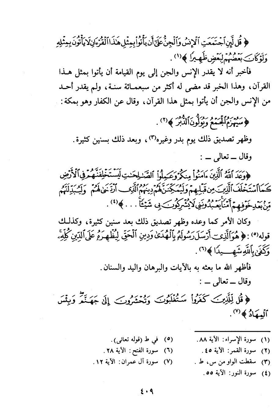 فَأَخْبَرَ أَنَّهُ لَا يَقْدِرُ الْإِنْسُ وَالْجِنُّ إِلَى يَوْمِ الْقِيَامَةِ أَنْ يَأْتُوا بِمِثْلِ هَذَا الْقُرْآنِ، وَهَذَا الْخَبَرُ قَدْ مَضَى لَهُ أَكْثَرُ مِنْ سَبْعِمِائَةِ سَنَةٍ، وَلَمْ يَقْدِرْ أَحَدٌ مِنَ الْإِنْسِ وَالْجِنِّ أَنْ يَأْتُوا بِمِثْلِ هَذَا الْقُرْآنِ، وَقَالَ عَنِ الْكُفَّارِ وَهُوَ بِمَكَّةَ: {سَيُهْزَمُ الْجَمْعُ وَيُوَلُّونَ الدُّبُرَ} [القمر: 45] .