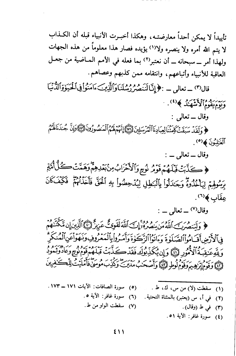 وَقَالَ تَعَالَى: {وَلَقَدْ سَبَقَتْ كَلِمَتُنَا لِعِبَادِنَا الْمُرْسَلِينَ - إِنَّهُمْ لَهُمُ الْمَنْصُورُونَ - وَإِنَّ جُنْدَنَا لَهُمُ الْغَالِبُونَ} [الصافات: 171 - 173] .