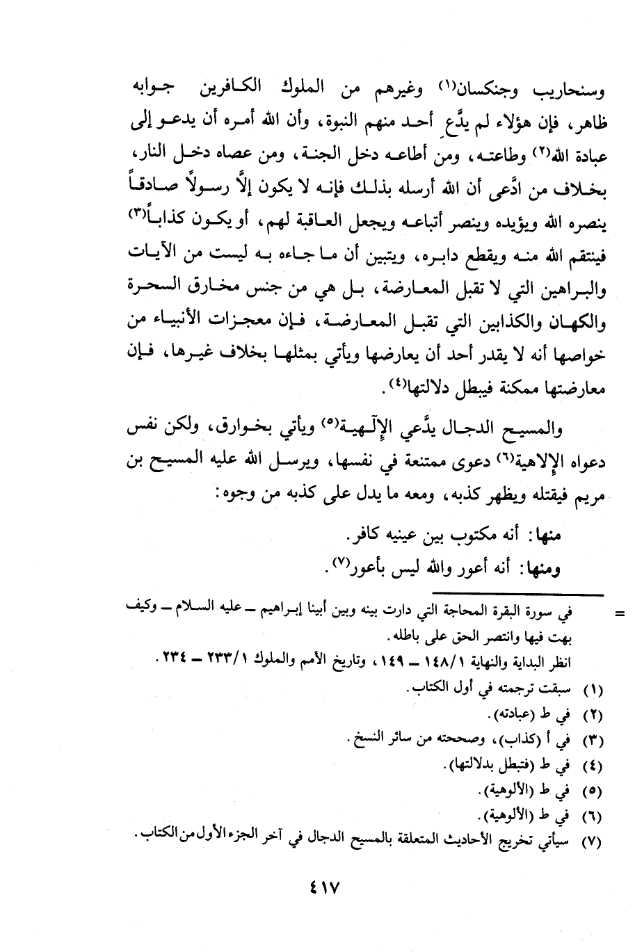وَالْمَسِيحُ الدَّجَّالُ: يَدَّعِي الْإِلَهِيَّةَ، وَيَأْتِي بِخَوَارِقَ، وَلَكِنَّ نَفْسَ دَعْوَاهُ الْإِلَهِيَّةَ دَعْوَى مُمْتَنِعَةٌ فِي نَفْسِهَا، وَيُرْسِلُ اللَّهُ عَلَيْهِ الْمَسِيحَ ابْنَ مَرْيَمَ فَيَقْتُلُهُ وَيُظْهِرُ كَذِبَهُ، وَمَعَهُ مَا يَدُلُّ عَلَى كَذِبِهِ مِنْ وُجُوهٍ: