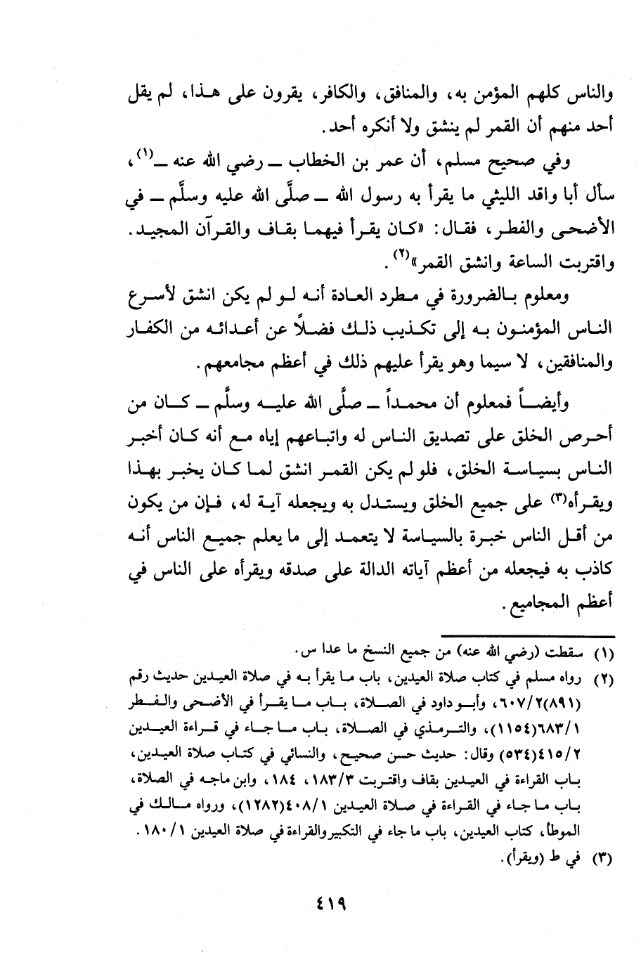 وَفِي صَحِيحِ مُسْلِمٍ أَنَّ عُمَرَ بْنَ الْخَطَّابِ رَضِيَ اللَّهُ عَنْهُ: سَأَلَ أَبَا وَاقِدٍ اللَّيْثِيَّ مَا يَقْرَأُ بِهِ رَسُولُ اللَّهِ صَلَّى اللَّهُ عَلَيْهِ وَسَلَّمَ فِي الْأَضْحَى وَالْفِطْرِ، فَقَالَ: كَانَ يَقْرَأُ فِيهِمَا بِـ {ق وَالْقُرْآنِ الْمَجِيدِ} [ق: 1] وَ {اقْتَرَبَتِ السَّاعَةُ وَانْشَقَّ الْقَمَرُ} [القمر: 1] .