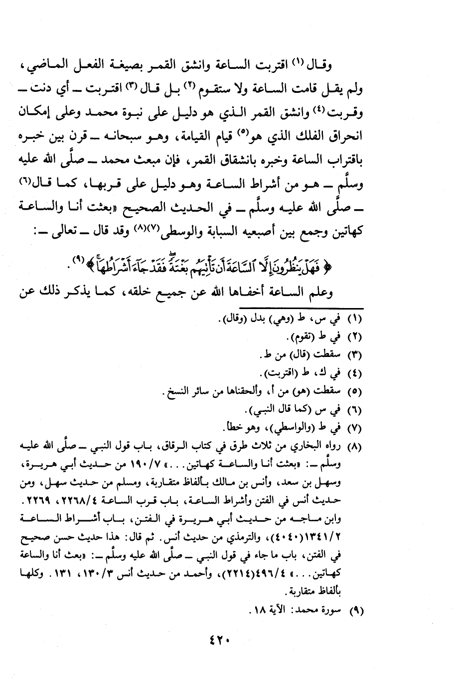 وَقَالَ: {اقْتَرَبَتِ السَّاعَةُ وَانْشَقَّ الْقَمَرُ} [القمر: 1] بِصِيغَةِ الْفِعْلِ الْمَاضِي، وَلَمْ يَقُلْ قَامَتِ السَّاعَةُ، وَلَا سَتَقُومُ، بَلْ قَالَ: {اقْتَرَبَتِ} [القمر: 1] أَيْ دَنَتْ وَقَرُبَتْ، وَ {وَانْشَقَّ الْقَمَرُ} [القمر: 1] الَّذِي هُوَ دَلِيلٌ عَلَى نُبُوَّةِ مُحَمَّدٍ وَعَلَى إِمْكَانِ انْحِرَاقِ الْفَلَكِ الَّذِي هُوَ قِيَامُ الْقِيَامَةِ، وَهُوَ سُبْحَانُهُ قَرَنَ بَيْنَ خَبَرِهِ بِاقْتِرَابِ السَّاعَةِ وَخَبَرِهِ بِانْشِقَاقِ الْقَمَرِ، فَإِنَّ مَبْعَثَ مُحَمَّدٍ صَلَّى اللَّهُ عَلَيْهِ وَسَلَّمَ هُوَ مِنْ أَشْرَاطِ السَّاعَةِ وَهُوَ دَلِيلٌ عَلَى قُرْبِهَا، كَمَا قَالَ صَلَّى اللَّهُ عَلَيْهِ وَسَلَّمَ فِي الْحَدِيثِ الصَّحِيحِ: بُعِثْتُ أَنَا وَالسَّاعَةُ كَهَاتَيْنِ، وَجَمَعَ بَيْنَ أُصْبُعَيْهِ السَّبَّابَةِ وَالْوُسْطَى. وَقَدْ قَالَ تَعَالَى: {فَهَلْ يَنْظُرُونَ إِلَّا السَّاعَةَ أَنْ تَأْتِيَهُمْ بَغْتَةً فَقَدْ جَاءَ أَشْرَاطُهَا} [محمد: 18] .