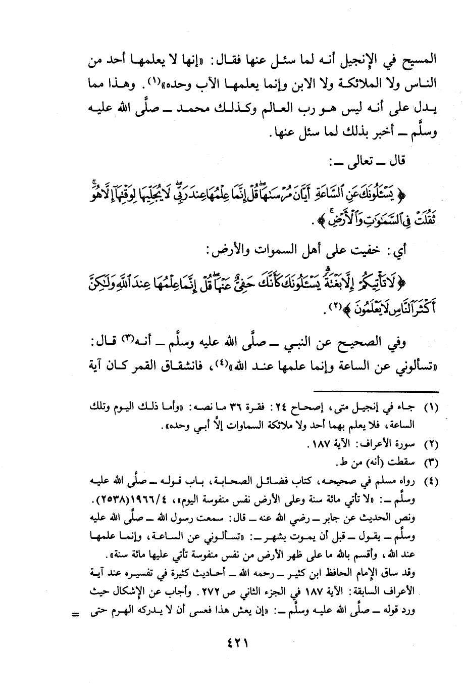 الْمَسِيحِ فِي الْإِنْجِيلِ، أَنَّهُ لَمَّا سُئِلَ عَنْهَا فَقَالَ: إِنَّهَا لَا يَعْلَمُهَا أَحَدٌ مِنَ النَّاسِ وَلَا الْمَلَائِكَةُ وَلَا الِابْنُ، وَإِنَّمَا يَعْلَمُهَا الْأَبُ وَحْدَهُ. وَهَذَا مِمَّا يَدُلُّ عَلَى أَنَّهُ لَيْسَ هُوَ رَبَّ الْعَالَمِ، وَكَذَلِكَ مُحَمَّدٌ صَلَّى اللَّهُ عَلَيْهِ وَسَلَّمَ أَخْبَرَ بِذَلِكَ لَمَّا سُئِلَ عَنْهَا. قَالَ تَعَالَى {يَسْأَلُونَكَ عَنِ السَّاعَةِ أَيَّانَ مُرْسَاهَا - قُلْ إِنَّمَا عِلْمُهَا عِنْدَ رَبِّي لَا يُجَلِّيهَا لِوَقْتِهَا إِلَّا هُوَ ثَقُلَتْ فِي السَّمَاوَاتِ وَالْأَرْضِ} [الأعراف: 187] .