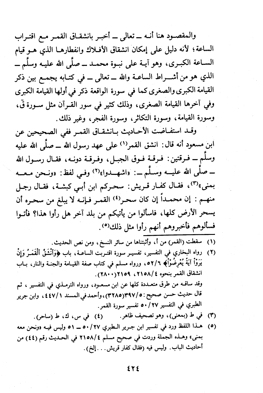 وَقَدِ اسْتَفَاضَتِ الْأَحَادِيثُ بِانْشِقَاقِ الْقَمَرِ، فَفِي الصَّحِيحَيْنِ، عَنِ ابْنِ مَسْعُودٍ أَنَّهُ قَالَ: انْشَقَّ الْقَمَرُ عَلَى عَهْدِ رَسُولِ اللَّهِ صَلَّى اللَّهُ عَلَيْهِ وَسَلَّمَ فِرْقَتَيْنِ: فِرْقَةً فَوْقَ الْجَبَلِ، وَفِرْقَةً دُونَهُ، فَقَالَ رَسُولُ اللَّهِ صَلَّى اللَّهُ عَلَيْهِ وَسَلَّمَ: اشْهَدُوا، وَفِي لَفْظٍ وَنَحْنُ مَعَهُ بِمِنًى، فَقَالَ كُفَّارُ قُرَيْشٍ سَحَرَكُمُ ابْنُ أَبِي كَبْشَةَ، فَقَالَ رَجُلٌ مِنْهُمْ: إِنَّ مُحَمَّدًا إِنْ كَانَ سَحَرَ الْقَمَرَ فَإِنَّهُ لَا يَبْلُغُ مِنْ سِحْرِهِ أَنْ يَسْحَرَ الْأَرْضَ كُلَّهَا، فَاسْأَلُوا مَنْ يَأْتِيكُمْ مِنْ بَلَدٍ آخَرَ، هَلْ رَأَوْا هَذَا؟ فَأَتَوْا فَسَأَلُوهُمْ فَأَخْبَرُوهُمْ أَنَّهُمْ رَأَوْا مِثْلَ ذَلِكَ.