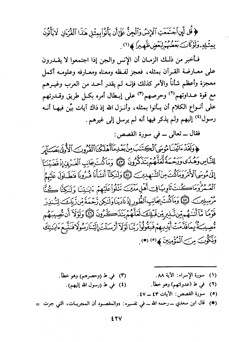 فَأَخْبَرَ مِنْ ذَلِكَ الزَّمَانِ أَنَّ الْإِنْسَ وَالْجِنَّ إِذَا اجْتَمَعُوا لَا يَقْدِرُونَ عَلَى مُعَارَضَةِ الْقُرْآنِ بِمِثْلِهِ، فَعَجَّزَ لَفْظُهُ وَمَعْنَاهُ وَمَعَارِفُهُ وَعُلُومُهُ أَكْمَلَ مُعْجِزَةٍ وَأَعْظَمَ شَأْنًا، وَالْأَمْرُ كَذَلِكَ فَإِنَّهُ لَمْ يَقْدِرْ أَحَدٌ مِنَ الْعَرَبِ وَغَيْرِهِمْ مَعَ قُوَّةِ عَدَاوَتِهِمْ وَحِرْصِهِمْ عَلَى إِبْطَالِ أَمْرِهِ بِكُلِّ طَرِيقٍ وَقُدْرَتِهِمْ عَلَى أَنْوَاعِ الْكَلَامِ أَنْ يَأْتُوا بِمِثْلِهِ، وَأَنْزَلَ اللَّهُ إِذْ ذَاكَ آيَاتٍ بَيَّنَ فِيهَا أَنَّهُ رَسُولٌ إِلَيْهِمْ، وَلَمْ يَذْكُرْ فِيهَا أَنَّهُ لَمْ يُرْسَلْ إِلَى غَيْرِهِمْ. فَقَالَ تَعَالَى فِي سُورَةِ الْقَصَصِ: {وَلَقَدْ آتَيْنَا مُوسَى الْكِتَابَ مِنْ بَعْدِ مَا أَهْلَكْنَا الْقُرُونَ الْأُولَى بَصَائِرَ لِلنَّاسِ وَهُدًى وَرَحْمَةً لَعَلَّهُمْ يَتَذَكَّرُونَ - وَمَا كُنْتَ بِجَانِبِ الْغَرْبِيِّ إِذْ قَضَيْنَا إِلَى مُوسَى الْأَمْرَ وَمَا كُنْتَ مِنَ الشَّاهِدِينَ - وَلَكِنَّا أَنْشَأْنَا قُرُونًا فَتَطَاوَلَ عَلَيْهِمُ الْعُمُرُ وَمَا كُنْتَ ثَاوِيًا فِي أَهْلِ مَدْيَنَ تَتْلُو عَلَيْهِمْ آيَاتِنَا وَلَكِنَّا كُنَّا مُرْسِلِينَ - وَمَا كُنْتَ بِجَانِبِ الطُّورِ إِذْ نَادَيْنَا وَلَكِنْ رَحْمَةً مِنْ رَبِّكَ لِتُنْذِرَ قَوْمًا مَا أَتَاهُمْ مِنْ نَذِيرٍ مِنْ قَبْلِكَ لَعَلَّهُمْ يَتَذَكَّرُونَ - وَلَوْلَا أَنْ تُصِيبَهُمْ مُصِيبَةٌ بِمَا قَدَّمَتْ أَيْدِيهِمْ فَيَقُولُوا رَبَّنَا لَوْلَا أَرْسَلْتَ إِلَيْنَا رَسُولًا فَنَتَّبِعَ آيَاتِكَ وَنَكُونَ مِنَ الْمُؤْمِنِينَ} [القصص: 43 - 47] .