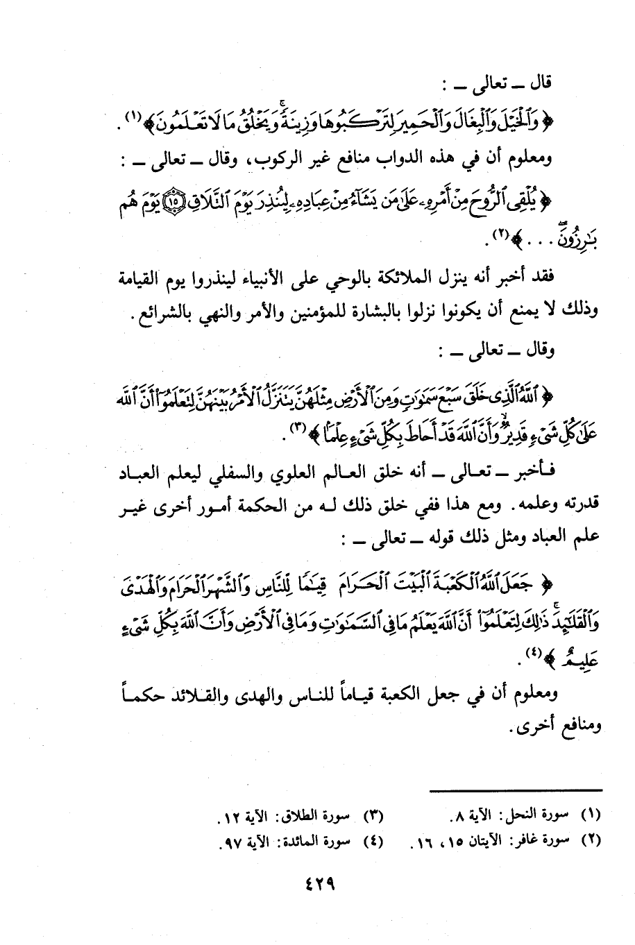 وَمَعْلُومٌ أَنَّ فِي هَذِهِ الدَّوَابِّ مَنَافِعَ غَيْرَ الرُّكُوبِ، وَقَالَ تَعَالَى: {يُلْقِي الرُّوحَ مِنْ أَمْرِهِ عَلَى مَنْ يَشَاءُ مِنْ عِبَادِهِ لِيُنْذِرَ يَوْمَ التَّلَاقِ يَوْمَ هُمْ بَارِزُونَ} [غافر: 15] .