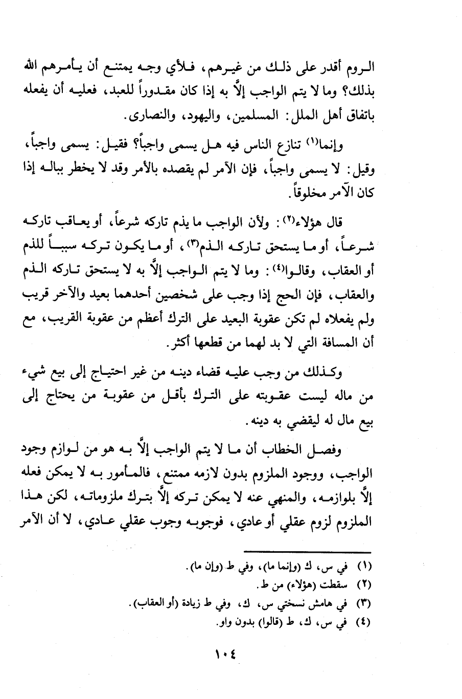 وَفَصْلُ الْخِطَابِ أَنَّ مَا لَا يَتِمُّ الْوَاجِبُ إِلَّا بِهِ هُوَ مِنْ لَوَازِمِ وُجُودِ الْوَاجِبِ وَوُجُودُ الْمَلْزُومِ بِدُونِ لَازِمِهِ مُمْتَنِعٌ فَالْمَأْمُورُ بِهِ لَا يُمْكِنُ فِعْلُهُ إِلَّا بِلَوَازِمِهِ وَالْمَنْهِيُّ عَنْهُ لَا يُمْكِنُ تَرْكُهُ إِلَّا بِتَرْكِ مَلْزُومَاتِهِ لَكِنَّ هَذَا الْمَلْزُومَ لُزُومٌ عَقْلِيٌّ أَوْ عَادِيٌّ فَوُجُوبُهُ وُجُوبٌ عَقْلِيٌّ عَادِيٌّ لَا أَنَّ الْآمِرَ
