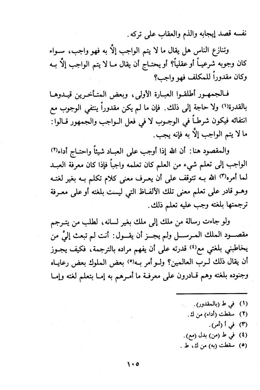 فَالْجُمْهُورُ أَطْلَقُوا الْعِبَارَةَ الْأُولَى وَبَعْضُ الْمُتَأَخِّرِينَ قَيَّدُوهَا بِالْقُدْرَةِ وَلَا حَاجَةَ إِلَى ذَلِكَ، فَإِنَّ مَا لَمْ يَكُنْ مَقْدُورًا يَنْتَفِي الْوُجُوبُ مَعَ انْتِفَائِهِ فَيَكُونُ شَرْطًا فِي الْوُجُوبِ لَا فِي فِعْلِ الْوَاجِبِ وَالْجُمْهُورُ قَالُوا: مَا لَا يَتِمُّ الْوَاجِبُ إِلَّا بِهِ، فَإِنَّهُ يَجِبُ.