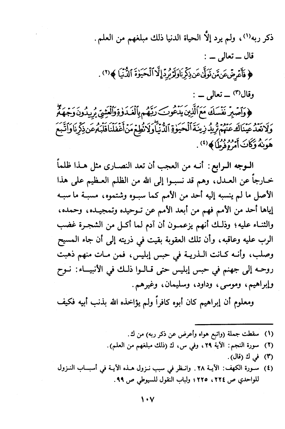 الْوَجْهُ الرَّابِعُ: أَنَّهُ مِنَ الْعَجَبِ أَنْ تَعُدَّ النَّصَارَى مِثْلَ هَذَا ظُلْمًا خَارِجًا عَنِ الْعَدْلِ وَهُمْ قَدْ نَسَبُوا إِلَى اللَّهِ مِنَ الظُّلْمِ الْعَظِيمِ عَلَى هَذَا الْأَصْلِ مَا لَمْ يَنْسُبْهُ إِلَيْهِ أَحَدٌ مِنَ الْأُمَمِ كَمَا سَبُّوهُ وَشَتَمُوهُ مَسَبَّةً مَا سَبَّهُ إِيَّاهَا أَحَدٌ مِنَ الْأُمَمِ فَهُمْ مِنْ أَبْعَدِ الْأُمَمِ عَنْ تَوْحِيدِهِ وَتَمْجِيدِهِ وَحَمْدِهِ وَالثَّنَاءِ عَلَيْهِ وَذَلِكَ أَنَّهُمْ يَزْعُمُونَ أَنَّ آدَمَ لَمَّا أَكَلَ مِنَ الشَّجَرَةِ غَضِبَ الرَّبُّ عَلَيْهِ وَعَاقَبَهُ وَأَنَّ تِلْكَ الْعُقُوبَةَ بَقِيَتْ فِي ذُرِّيَّتِهِ إِلَى أَنْ جَاءَ الْمَسِيحُ وَصُلِبَ وَأَنَّهُ كَانَتِ الذُّرِّيَّةُ فِي حَبْسِ إِبْلِيسَ فَمَنْ مَاتَ مِنْهُمْ ذَهَبَتْ رُوحُهُ إِلَى جَهَنَّمَ فِي حَبْسِ إِبْلِيسَ حَتَّى قَالُوا: ذَلِكَ فِي الْأَنْبِيَاءِ نُوحٍ وَإِبْرَاهِيمَ وَمُوسَى وَدَاوُدَ وَسُلَيْمَانَ وَغَيْرِهِمْ.