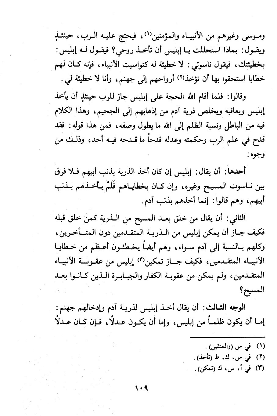 أَحَدُهَا: أَنْ يُقَالَ إِبْلِيسُ إِنْ كَانَ أَخَذَ الذُّرِّيَّةَ بِذَنْبِ أَبِيهِمْ فَلَا فَرْقَ بَيْنَ نَاسُوتِ الْمَسِيحِ وَغَيْرِهِ وَإِنْ كَانَ بِخَطَايَاهُمْ فَلَمْ يَأْخُذْهُمْ بِذَنْبِ أَبِيهِمْ وَهُمْ قَالُوا إِنَّمَا أَخَذَهُمْ بِذَنْبِ آدَمَ.