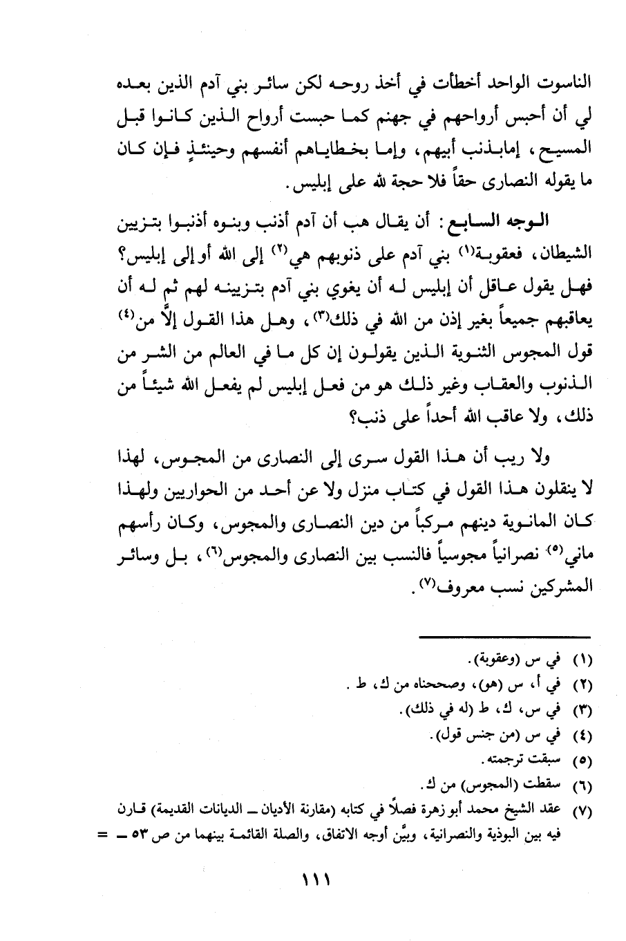 الْوَجْهُ السَّابِعُ: أَنْ يُقَالَ هَبْ أَنَّ آدَمَ أَذْنَبَ وَبَنُوهُ أَذْنَبُوا بِتَزْيِينِ الشَّيْطَانِ فَعُقُوبَةُ بَنِي آدَمَ عَلَى ذُنُوبِهِمْ هِيَ إِلَى اللَّهِ أَوْ إِلَى إِبْلِيسَ؟ فَهَلْ يَقُولُ عَاقِلٌ أَنَّ إِبْلِيسَ لَهُ أَنْ يُغْوِيَ بَنِي آدَمَ بِتَزْيِينِهِ لَهُمْ ثُمَّ لَهُ أَنْ يُعَاقِبَهُمْ جَمِيعًا بِغَيْرِ إِذْنٍ مِنَ اللَّهِ فِي ذَلِكَ وَهَلْ هَذَا الْقَوْلُ إِلَّا مِنْ قَوْلِ الْمَجُوسِ الثَّنَوِيَّةِ الَّذِينَ يَقُولُونَ إِنَّ كُلَّ مَا فِي الْعَالَمِ مِنَ الشَّرِّ مِنَ الذُّنُوبِ وَالْعِقَابِ وَغَيْرِ ذَلِكَ هُوَ مِنْ فِعْلِ إِبْلِيسَ لَمْ يَفْعَلِ اللَّهُ شَيْئًا مِنْ ذَلِكَ وَلَا عَاقَبَ اللَّهُ أَحَدًا عَلَى ذَنْبٍ.
