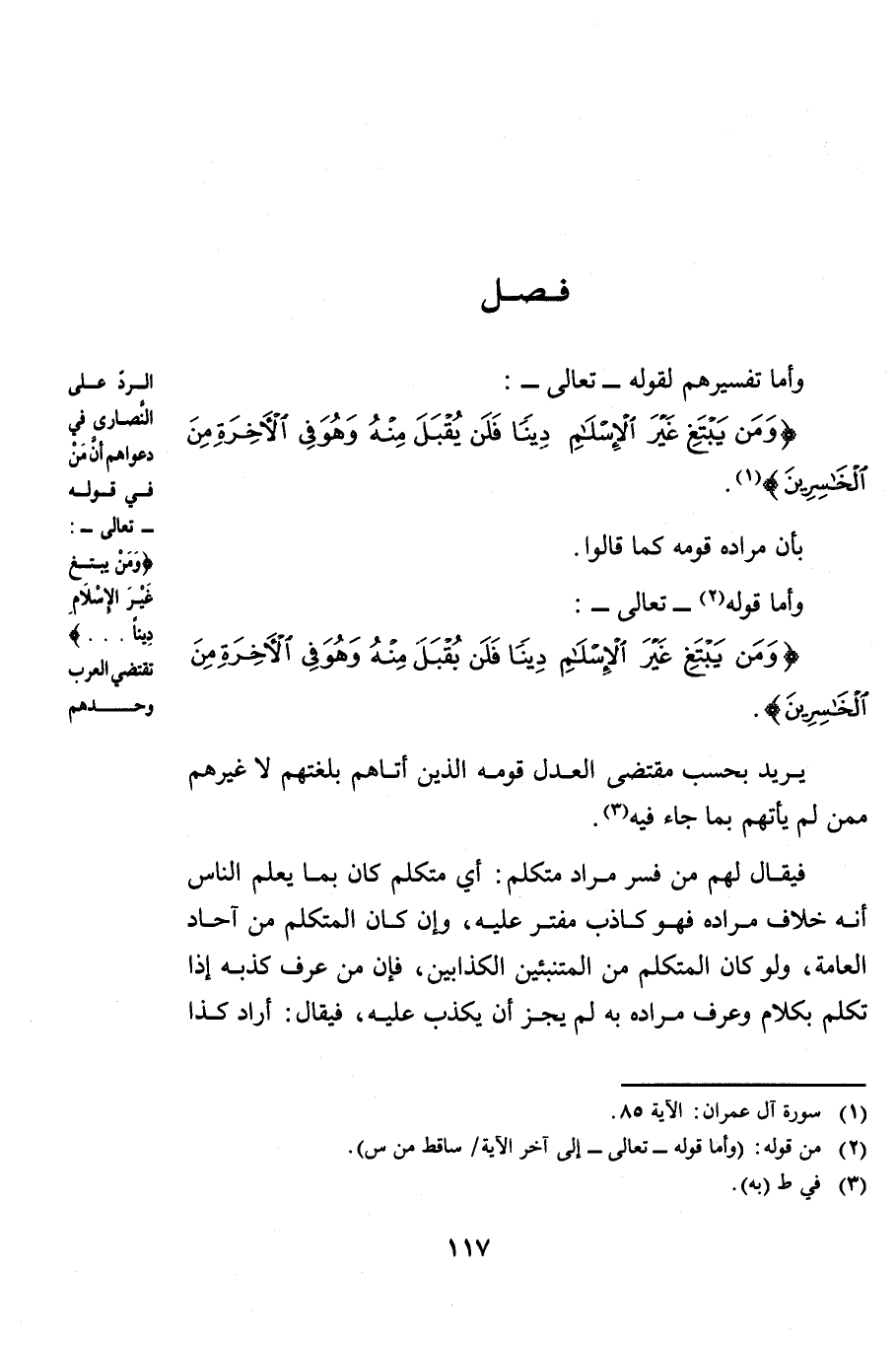 [فَصْلٌ: الرَّدُّ عَلَى النَّصَارَى فِي دَعْوَاهُمْ أَنَّ مَنْ فِي قَوْلِهِ تَعَالَى وَمَنْ يَبْتَغِ غَيْرَ الْإِسْلَامِ دِينًا. . . تَقْتَضِي الْعَرَبَ وَحْدَهُمْ]