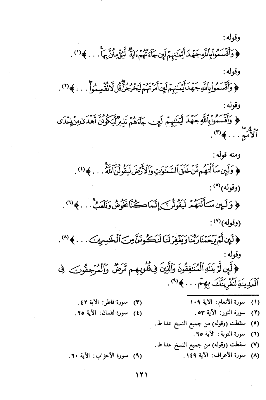 وَقَوْلُهُ: {وَأَقْسَمُوا بِاللَّهِ جَهْدَ أَيْمَانِهِمْ لَئِنْ جَاءَتْهُمْ آيَةٌ لَيُؤْمِنُنَّ بِهَا} [الأنعام: 109] وَقَوْلُهُ: {وَأَقْسَمُوا بِاللَّهِ جَهْدَ أَيْمَانِهِمْ لَئِنْ أَمَرْتَهُمْ لَيَخْرُجُنَّ قُلْ لَا تُقْسِمُوا} [النور: 53] وَقَوْلُهُ: {وَأَقْسَمُوا بِاللَّهِ جَهْدَ أَيْمَانِهِمْ لَئِنْ جَاءَهُمْ نَذِيرٌ لَيَكُونُنَّ أَهْدَى مِنْ إِحْدَى الْأُمَمِ} [فاطر: 42] وَمِنْهُ قَوْلُهُ: {وَلَئِنْ سَأَلْتَهُمْ مَنْ خَلَقَ السَّمَاوَاتِ وَالْأَرْضَ لَيَقُولُنَّ اللَّهُ} [لقمان: 25] (وَقَوْلُهُ) : {وَلَئِنْ سَأَلْتَهُمْ لَيَقُولُنَّ إِنَّمَا كُنَّا نَخُوضُ وَنَلْعَبُ} [التوبة: 65] (وَقَوْلُهُ) : {لَئِنْ لَمْ يَرْحَمْنَا رَبُّنَا وَيَغْفِرْ لَنَا لَنَكُونَنَّ مِنَ الْخَاسِرِينَ} [الأعراف: 149] وَقَوْلُهُ: {لَئِنْ لَمْ يَنْتَهِ الْمُنَافِقُونَ وَالَّذِينَ فِي قُلُوبِهِمْ مَرَضٌ وَالْمُرْجِفُونَ فِي الْمَدِينَةِ لَنُغْرِيَنَّكَ بِهِمْ} [الأحزاب: 60]