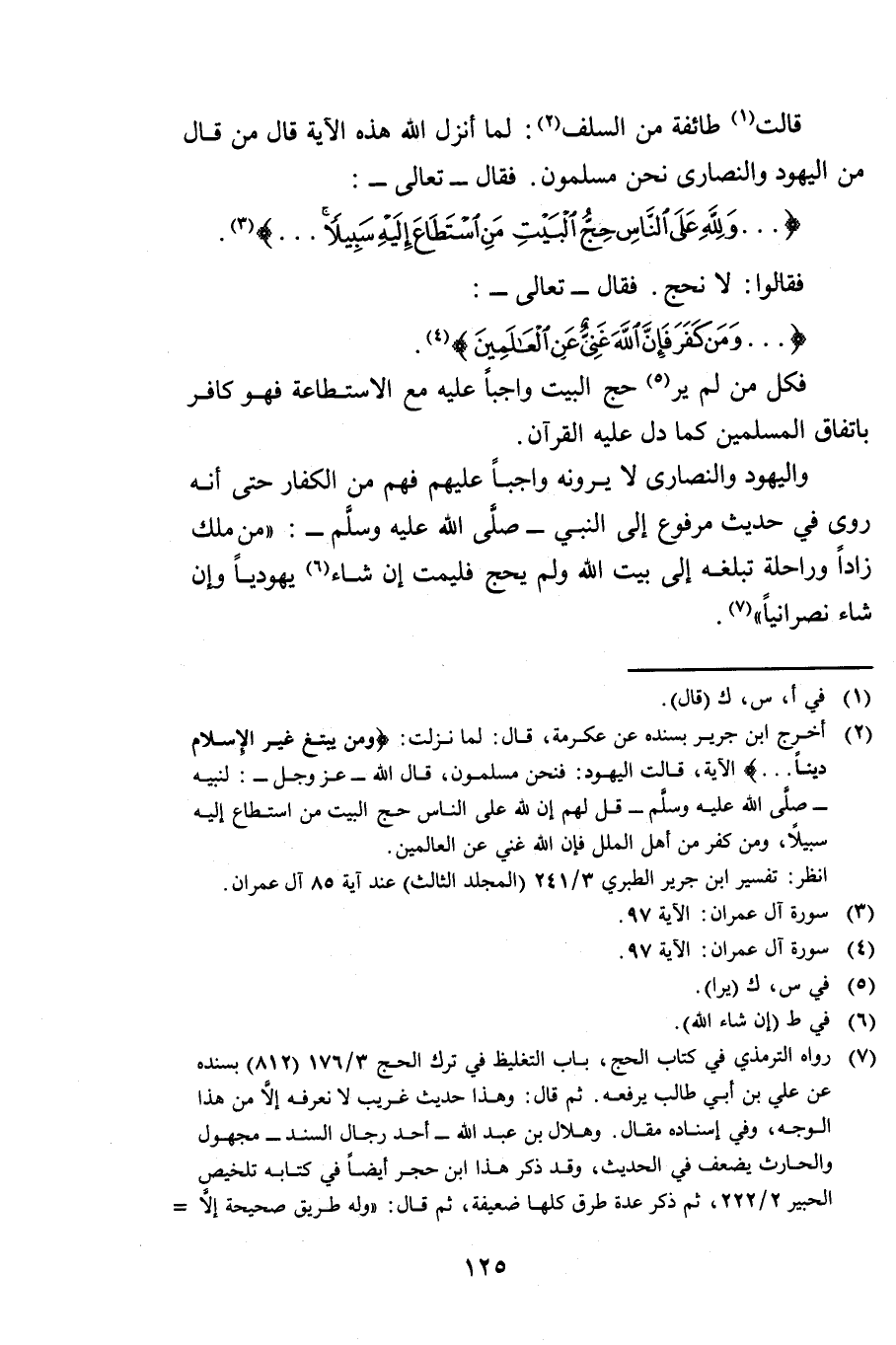 قَالَتْ طَائِفَةٌ مِنَ السَّلَفِ: لَمَّا أَنْزَلَ اللَّهُ هَذِهِ الْآيَةَ قَالَ مَنْ قَالَ مِنَ الْيَهُودِ وَالنَّصَارَى نَحْنُ مُسْلِمُونَ. فَقَالَ - تَعَالَى -: {وَلِلَّهِ عَلَى النَّاسِ حِجُّ الْبَيْتِ مَنِ اسْتَطَاعَ إِلَيْهِ سَبِيلًا} [آل عمران: 97] فَقَالُوا: لَا نَحُجُّ فَقَالَ - تَعَالَى -: {وَمَنْ كَفَرَ فَإِنَّ اللَّهَ غَنِيٌّ عَنِ الْعَالَمِينَ} [آل عمران: 97] فَكُلُّ مَنْ لَمْ يَرَ حَجَّ الْبَيْتِ وَاجِبًا عَلَيْهِ مَعَ الِاسْتِطَاعَةِ فَهُوَ كَافِرٌ بِاتِّفَاقِ الْمُسْلِمِينَ كَمَا دَلَّ عَلَيْهِ الْقُرْآنُ.