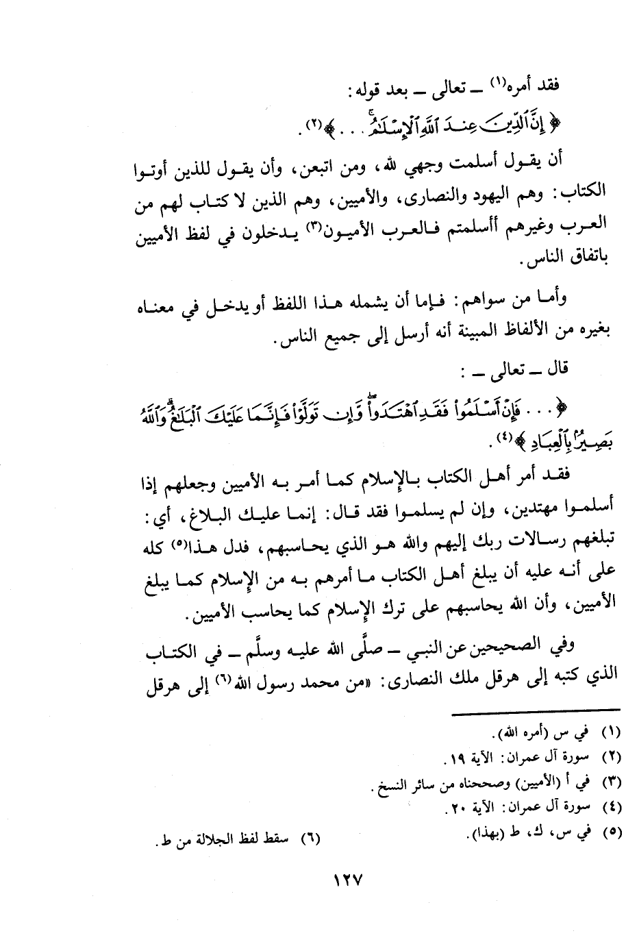 قَالَ - تَعَالَى -: {فَإِنْ أَسْلَمُوا فَقَدِ اهْتَدَوْا وَإِنْ تَوَلَّوْا فَإِنَّمَا عَلَيْكَ الْبَلَاغُ وَاللَّهُ بَصِيرٌ بِالْعِبَادِ} [آل عمران: 20] فَقَدَ أَمْرَ أَهْلَ الْكِتَابِ بِالْإِسْلَامِ كَمَا أَمَرَ بِهِ الْأُمِّيِّينَ وَجَعَلَهُمْ إِذَا أَسْلَمُوا مُهْتَدِينَ وَإِنْ لَمْ يُسْلِمُوا فَقَدْ قَالَ: (إِنَّمَا عَلَيْكَ الْبَلَاغُ) أَيْ تُبَلِّغُهُمْ رِسَالَاتِ رَبِّكَ إِلَيْهِمْ وَاللَّهُ هُوَ الَّذِي يُحَاسِبُهُمْ فَدَلَّ هَذَا كُلُّهُ عَلَى أَنَّهُ عَلَيْهِ أَنْ يُبَلِّغَ أَهْلَ الْكِتَابِ مَا أَمَرَهُمْ بِهِ مِنَ الْإِسْلَامِ كَمَا يُبَلِّغُ الْأُمِّيِّينَ، وَأَنَّ اللَّهَ يُحَاسِبُهُمْ عَلَى تَرْكِ الْإِسْلَامِ كَمَا يُحَاسِبُ الْأُمِّيِّينَ.