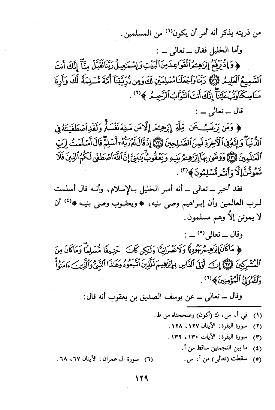 وَقَالَ - تَعَالَى -: {مَا كَانَ إِبْرَاهِيمُ يَهُودِيًّا وَلَا نَصْرَانِيًّا وَلَكِنْ كَانَ حَنِيفًا مُسْلِمًا وَمَا كَانَ مِنَ الْمُشْرِكِينَ} [آل عمران: 67] (67) {إِنَّ أَوْلَى النَّاسِ بِإِبْرَاهِيمَ لَلَّذِينَ اتَّبَعُوهُ وَهَذَا النَّبِيُّ وَالَّذِينَ آمَنُوا وَاللَّهُ وَلِيُّ الْمُؤْمِنِينَ} [آل عمران: 68] وَقَالَ - تَعَالَى -: عَنْ يُوسُفَ الصِّدِّيقِ ابْنِ يَعْقُوبَ أَنَّهُ قَالَ