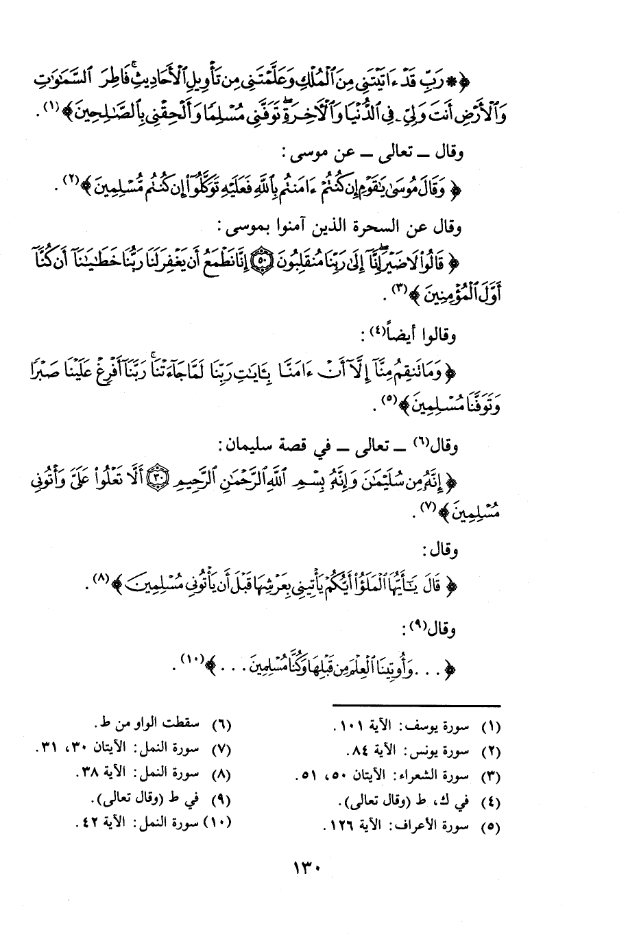 {رَبِّ قَدْ آتَيْتَنِي مِنَ الْمُلْكِ وَعَلَّمْتَنِي مِنْ تَأْوِيلِ الْأَحَادِيثِ فَاطِرَ السَّمَاوَاتِ وَالْأَرْضِ أَنْتَ وَلِيِّي فِي الدُّنْيَا وَالْآخِرَةِ تَوَفَّنِي مُسْلِمًا وَأَلْحِقْنِي بِالصَّالِحِينَ} [يوسف: 101] وَقَالَ - تَعَالَى -: عَنْ مُوسَى {وَقَالَ مُوسَى يَاقَوْمِ إِنْ كُنْتُمْ آمَنْتُمْ بِاللَّهِ فَعَلَيْهِ تَوَكَّلُوا إِنْ كُنْتُمْ مُسْلِمِينَ} [يونس: 84] وَقَالَ عَنِ السَّحَرَةِ الَّذِينَ آمَنُوا بِمُوسَى: {قَالُوا لَا ضَيْرَ إِنَّا إِلَى رَبِّنَا مُنْقَلِبُونَ} [الشعراء: 50] (50) {إِنَّا نَطْمَعُ أَنْ يَغْفِرَ لَنَا رَبُّنَا خَطَايَانَا أَنْ كُنَّا أَوَّلَ الْمُؤْمِنِينَ} [الشعراء: 51] وَقَالُوا أَيْضًا {وَمَا تَنْقِمُ مِنَّا إِلَّا أَنْ آمَنَّا بِآيَاتِ رَبِّنَا لَمَّا جَاءَتْنَا رَبَّنَا أَفْرِغْ عَلَيْنَا صَبْرًا وَتَوَفَّنَا مُسْلِمِينَ} [الأعراف: 126] وَقَالَ - تَعَالَى -: فِي قِصَّةِ سُلَيْمَانَ {إِنَّهُ مِنْ سُلَيْمَانَ وَإِنَّهُ بِسْمِ اللَّهِ الرَّحْمَنِ الرَّحِيمِ} [النمل: 30] (30) {أَلَّا تَعْلُوا عَلَيَّ وَأْتُونِي مُسْلِمِينَ} [النمل: 31] وَقَالَ {قَالَ يَاأَيُّهَا الْمَلَأُ أَيُّكُمْ يَأْتِينِي بِعَرْشِهَا قَبْلَ أَنْ يَأْتُونِي مُسْلِمِينَ} [النمل: 38] وَقَالَ: {وَأُوتِينَا الْعِلْمَ مِنْ قَبْلِهَا وَكُنَّا مُسْلِمِينَ} [النمل: 42]
