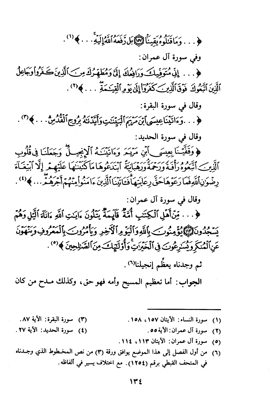 {وَمَا قَتَلُوهُ يَقِينًا بَلْ رَفَعَهُ اللَّهُ إِلَيْهِ} [النساء: 157] وَفِي سُورَةِ آلِ عِمْرَانَ {إِنِّي مُتَوَفِّيكَ وَرَافِعُكَ إِلَيَّ وَمُطَهِّرُكَ مِنَ الَّذِينَ كَفَرُوا وَجَاعِلُ الَّذِينَ اتَّبَعُوكَ فَوْقَ الَّذِينَ كَفَرُوا إِلَى يَوْمِ الْقِيَامَةِ} [آل عمران: 55] وَقَالَ: فِي سُورَةِ الْبَقَرَةِ {وَآتَيْنَا عِيسَى ابْنَ مَرْيَمَ الْبَيِّنَاتِ وَأَيَّدْنَاهُ بِرُوحِ الْقُدُسِ} [البقرة: 87] وَقَالَ: فِي سُورَةِ الْحَدِيدِ {وَقَفَّيْنَا بِعِيسَى ابْنِ مَرْيَمَ وَآتَيْنَاهُ الْإِنْجِيلَ وَجَعَلْنَا فِي قُلُوبِ الَّذِينَ اتَّبَعُوهُ رَأْفَةً وَرَحْمَةً وَرَهْبَانِيَّةً ابْتَدَعُوهَا مَا كَتَبْنَاهَا عَلَيْهِمْ إِلَّا ابْتِغَاءَ رِضْوَانِ اللَّهِ فَمَا رَعَوْهَا حَقَّ رِعَايَتِهَا فَآتَيْنَا الَّذِينَ آمَنُوا مِنْهُمْ أَجْرَهُمْ} [الحديد: 27] وَقَالَ فِي سُورَةِ آلِ عِمْرَانَ {مِنْ أَهْلِ الْكِتَابِ أُمَّةٌ قَائِمَةٌ يَتْلُونَ آيَاتِ اللَّهِ آنَاءَ اللَّيْلِ وَهُمْ يَسْجُدُونَ يُؤْمِنُونَ بِاللَّهِ وَالْيَوْمِ الْآخِرِ وَيَأْمُرُونَ بِالْمَعْرُوفِ وَيَنْهَوْنَ عَنِ الْمُنْكَرِ وَيُسَارِعُونَ فِي الْخَيْرَاتِ وَأُولَئِكَ مِنَ الصَّالِحِينَ} [آل عمران: 113] ثُمَّ وَجَدْنَاهُ يُعَظِّمُ إِنْجِيلَنَا.
