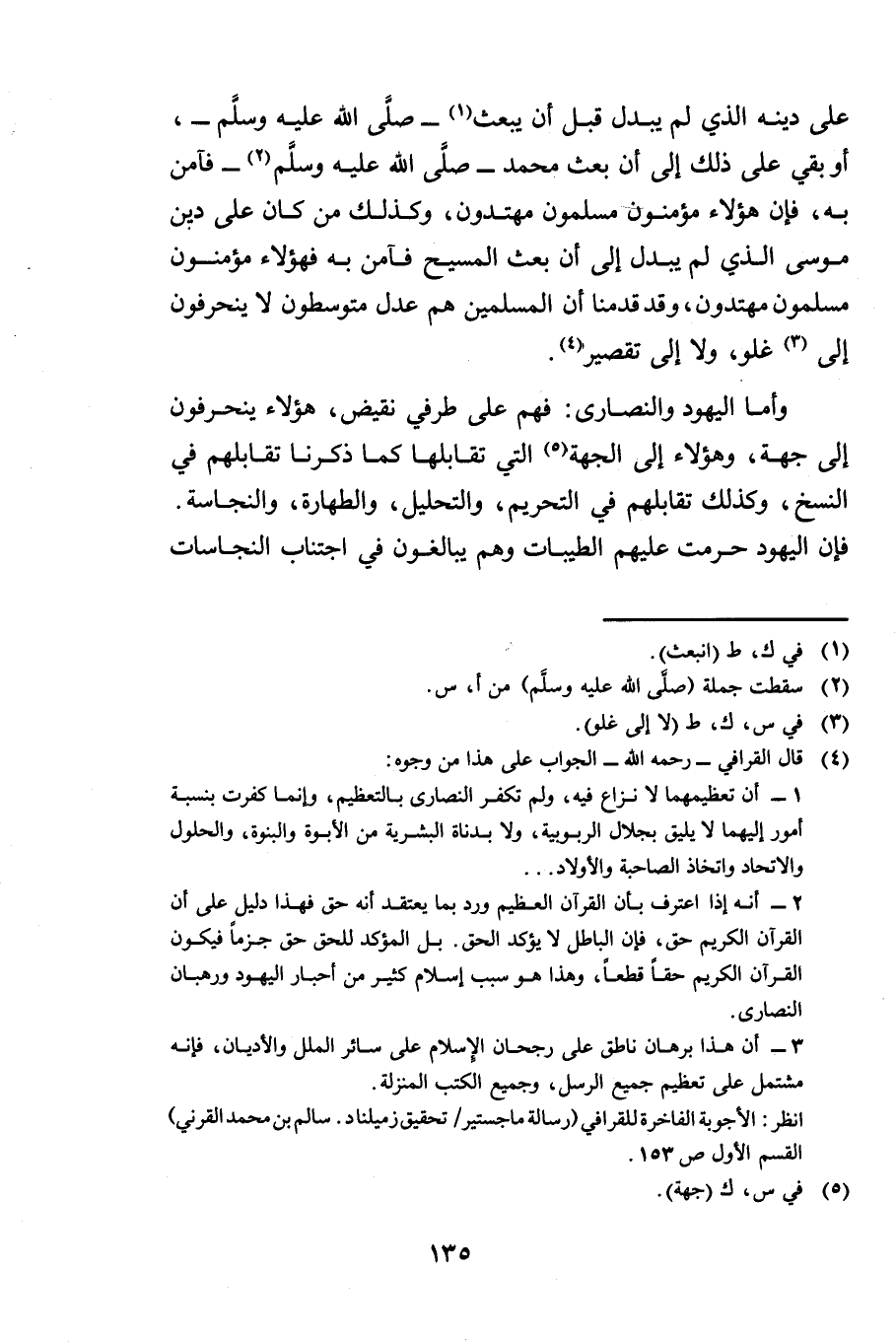 عَلَى دِينِهِ الَّذِي لَمْ يُبَدَّلْ قَبْلَ أَنْ يُبْعَثَ أَوْ بَقِيَ عَلَى ذَلِكَ إِلَى أَنْ بُعِثَ مُحَمَّدٌ فَآمَنَ بِهِ، فَإِنَّ هَؤُلَاءِ مُؤْمِنُونَ مُسْلِمُونَ مُهْتَدُونَ وَكَذَلِكَ مَنْ كَانَ عَلَى دِينِ مُوسَى الَّذِي لَمْ يُبَدَّلْ إِلَى أَنْ بُعِثَ الْمَسِيحُ فَآمَنَ بِهِ فَهَؤُلَاءِ مُؤْمِنُونَ مُسْلِمُونَ مُهْتَدُونَ وَقَدْ قَدَّمْنَا أَنَّ الْمُسْلِمِينَ هُمْ عَدْلٌ مُتَوَسِّطُونَ لَا يَنْحَرِفُونَ إِلَى غُلُوٍّ وَلَا إِلَى تَقْصِيرٍ.