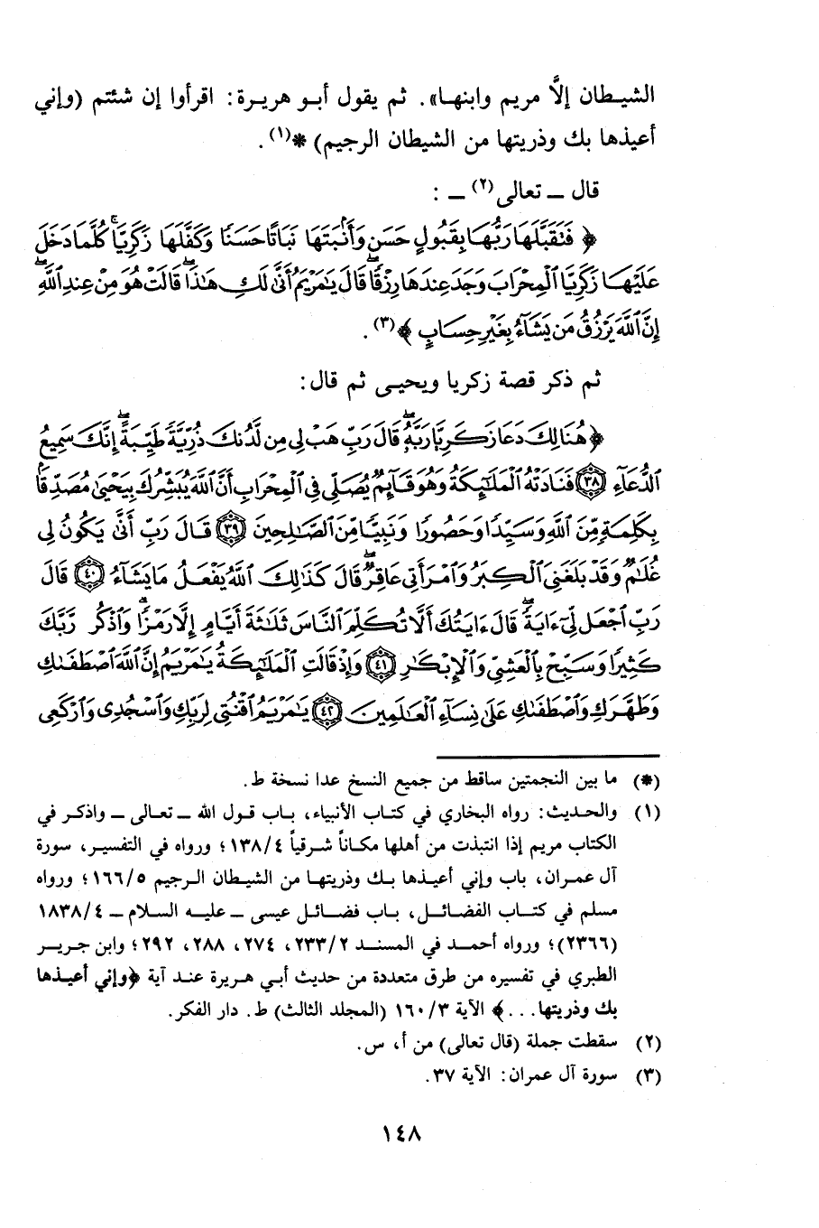 الشَّيْطَانِ إِلَّا مَرْيَمَ وَابْنَهَا ثُمَّ يَقُولُ أَبُو هُرَيْرَةَ اقْرَءُوا إِنْ شِئْتُمْ» {وَإِنِّي أُعِيذُهَا بِكَ وَذُرِّيَّتَهَا مِنَ الشَّيْطَانِ الرَّجِيمِ} [آل عمران: 36] قَالَ - تَعَالَى -: {فَتَقَبَّلَهَا رَبُّهَا بِقَبُولٍ حَسَنٍ وَأَنْبَتَهَا نَبَاتًا حَسَنًا وَكَفَّلَهَا زَكَرِيَّا كُلَّمَا دَخَلَ عَلَيْهَا زَكَرِيَّا الْمِحْرَابَ وَجَدَ عِنْدَهَا رِزْقًا قَالَ يَامَرْيَمُ أَنَّى لَكِ هَذَا قَالَتْ هُوَ مِنْ عِنْدِ اللَّهِ إِنَّ اللَّهَ يَرْزُقُ مَنْ يَشَاءُ بِغَيْرِ حِسَابٍ} [آل عمران: 37] ثُمَّ ذَكَرَ قِصَّةَ زَكَرِيَّا وَيَحْيَى ثُمَّ قَالَ