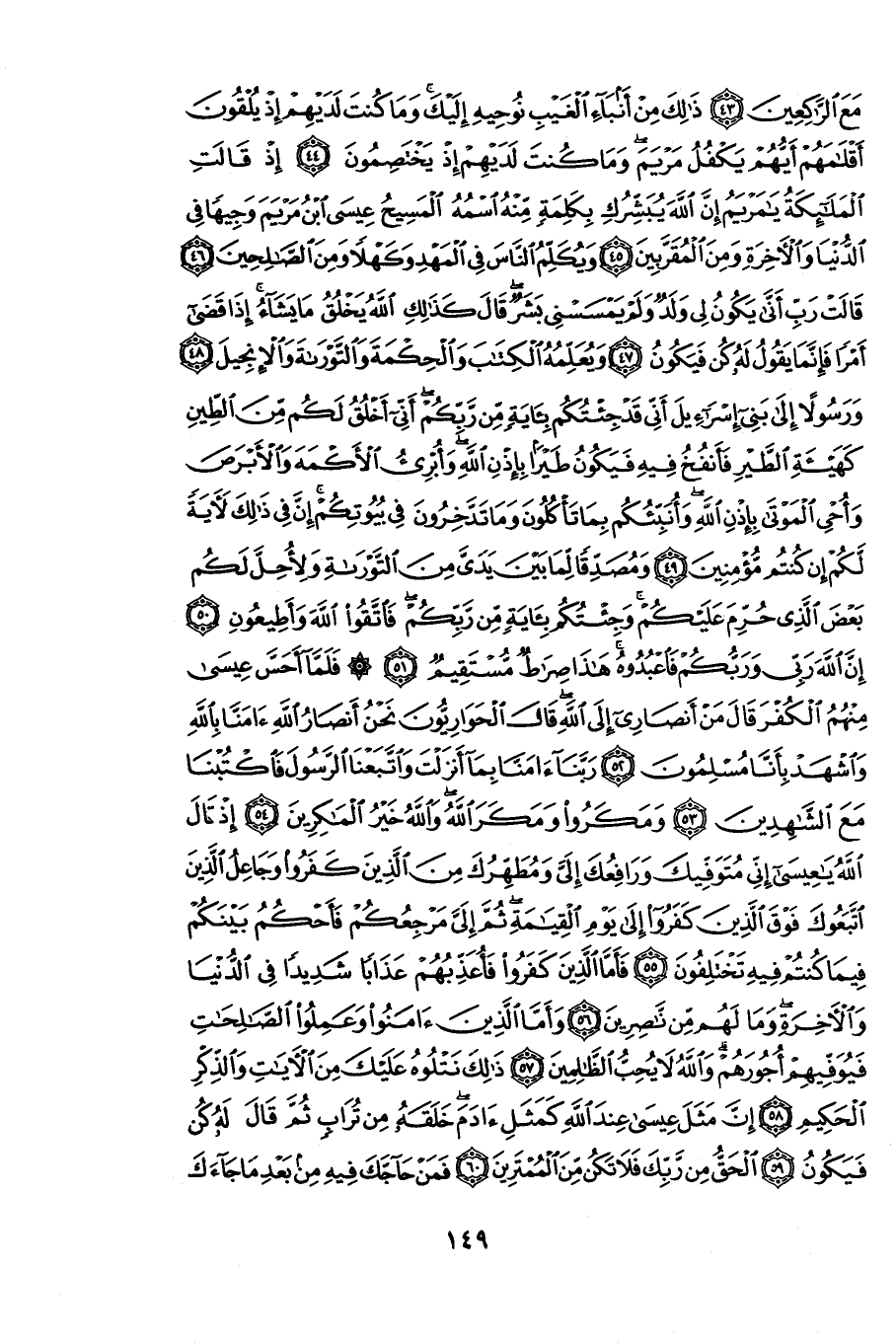 {هُنَالِكَ دَعَا زَكَرِيَّا رَبَّهُ قَالَ رَبِّ هَبْ لِي مِنْ لَدُنْكَ ذُرِّيَّةً طَيِّبَةً إِنَّكَ سَمِيعُ الدُّعَاءِ} [آل عمران: 38] (38) {فَنَادَتْهُ الْمَلَائِكَةُ وَهُوَ قَائِمٌ يُصَلِّي فِي الْمِحْرَابِ أَنَّ اللَّهَ يُبَشِّرُكَ بِيَحْيَى مُصَدِّقًا بِكَلِمَةٍ مِنَ اللَّهِ وَسَيِّدًا وَحَصُورًا وَنَبِيًّا مِنَ الصَّالِحِينَ} [آل عمران: 39] (39) {قَالَ رَبِّ أَنَّى يَكُونُ لِي غُلَامٌ وَقَدْ بَلَغَنِيَ الْكِبَرُ وَامْرَأَتِي عَاقِرٌ قَالَ كَذَلِكَ اللَّهُ يَفْعَلُ مَا يَشَاءُ} [آل عمران: 40] (40) {قَالَ رَبِّ اجْعَلْ لِي آيَةً قَالَ آيَتُكَ أَلَّا تُكَلِّمَ النَّاسَ ثَلَاثَةَ أَيَّامٍ إِلَّا رَمْزًا وَاذْكُرْ رَبَّكَ كَثِيرًا وَسَبِّحْ بِالْعَشِيِّ وَالْإِبْكَارِ} [آل عمران: 41] (41) {وَإِذْ قَالَتِ الْمَلَائِكَةُ يَامَرْيَمُ إِنَّ اللَّهَ اصْطَفَاكِ وَطَهَّرَكِ وَاصْطَفَاكِ عَلَى نِسَاءِ الْعَالَمِينَ يَامَرْيَمُ اقْنُتِي لِرَبِّكِ وَاسْجُدِي وَارْكَعِي مَعَ الرَّاكِعِينَ} [آل عمران: 42] (43) {ذَلِكَ مِنْ أَنْبَاءِ الْغَيْبِ نُوحِيهِ إِلَيْكَ وَمَا كُنْتَ لَدَيْهِمْ إِذْ يُلْقُونَ أَقْلَامَهُمْ أَيُّهُمْ يَكْفُلُ مَرْيَمَ وَمَا كُنْتَ لَدَيْهِمْ إِذْ يَخْتَصِمُونَ} [آل عمران: 44] (44) {إِذْ قَالَتِ الْمَلَائِكَةُ يَامَرْيَمُ إِنَّ اللَّهَ يُبَشِّرُكِ بِكَلِمَةٍ مِنْهُ اسْمُهُ الْمَسِيحُ عِيسَى ابْنُ مَرْيَمَ وَجِيهًا فِي الدُّنْيَا وَالْآخِرَةِ وَمِنَ الْمُقَرَّبِينَ} [آل عمران: 45] (45) {وَيُكَلِّمُ النَّاسَ فِي الْمَهْدِ وَكَهْلًا وَمِنَ الصَّالِحِينَ} [آل عمران: 46] (46) {قَالَتْ رَبِّ أَنَّى يَكُونُ لِي وَلَدٌ وَلَمْ يَمْسَسْنِي بَشَرٌ قَالَ كَذَلِكِ اللَّهُ يَخْلُقُ مَا يَشَاءُ إِذَا قَضَى أَمْرًا فَإِنَّمَا يَقُولُ لَهُ كُنْ فَيَكُونُ} [آل عمران: 47] (47) {وَيُعَلِّمُهُ الْكِتَابَ وَالْحِكْمَةَ وَالتَّوْرَاةَ وَالْإِنْجِيلَ} [آل عمران: 48] (48) {وَرَسُولًا إِلَى بَنِي إِسْرَائِيلَ أَنِّي قَدْ جِئْتُكُمْ بِآيَةٍ مِنْ رَبِّكُمْ أَنِّي أَخْلُقُ لَكُمْ مِنَ الطِّينِ كَهَيْئَةِ الطَّيْرِ فَأَنْفُخُ فِيهِ فَيَكُونُ طَيْرًا بِإِذْنِ اللَّهِ وَأُبْرِئُ الْأَكْمَهَ وَالْأَبْرَصَ وَأُحْيِي الْمَوْتَى بِإِذْنِ اللَّهِ وَأُنَبِّئُكُمْ بِمَا تَأْكُلُونَ وَمَا تَدَّخِرُونَ فِي بُيُوتِكُمْ إِنَّ فِي ذَلِكَ لَآيَةً لَكُمْ إِنْ كُنْتُمْ مُؤْمِنِينَ} [آل عمران: 49] (49) {وَمُصَدِّقًا لِمَا بَيْنَ يَدَيَّ مِنَ التَّوْرَاةِ وَلِأُحِلَّ لَكُمْ بَعْضَ الَّذِي حُرِّمَ عَلَيْكُمْ وَجِئْتُكُمْ بِآيَةٍ مِنْ رَبِّكُمْ فَاتَّقُوا اللَّهَ وَأَطِيعُونِ} [آل عمران: 50] (50) {إِنَّ اللَّهَ رَبِّي وَرَبُّكُمْ فَاعْبُدُوهُ هَذَا صِرَاطٌ مُسْتَقِيمٌ} [آل عمران: 51] (51) {فَلَمَّا أَحَسَّ عِيسَى مِنْهُمُ الْكُفْرَ قَالَ مَنْ أَنْصَارِي إِلَى اللَّهِ قَالَ الْحَوَارِيُّونَ نَحْنُ أَنْصَارُ اللَّهِ آمَنَّا بِاللَّهِ وَاشْهَدْ بِأَنَّا مُسْلِمُونَ} [آل عمران: 52] (52) {رَبَّنَا آمَنَّا بِمَا أَنْزَلْتَ وَاتَّبَعْنَا الرَّسُولَ فَاكْتُبْنَا مَعَ الشَّاهِدِينَ وَمَكَرُوا وَمَكَرَ اللَّهُ وَاللَّهُ خَيْرُ الْمَاكِرِينَ} [آل عمران: 53] (54) {إِذْ قَالَ اللَّهُ يَاعِيسَى إِنِّي مُتَوَفِّيكَ وَرَافِعُكَ إِلَيَّ وَمُطَهِّرُكَ مِنَ الَّذِينَ كَفَرُوا وَجَاعِلُ الَّذِينَ اتَّبَعُوكَ فَوْقَ الَّذِينَ كَفَرُوا إِلَى يَوْمِ الْقِيَامَةِ ثُمَّ إِلَيَّ مَرْجِعُكُمْ فَأَحْكُمُ بَيْنَكُمْ فِيمَا كُنْتُمْ فِيهِ تَخْتَلِفُونَ} [آل عمران: 55] (55) {فَأَمَّا الَّذِينَ كَفَرُوا فَأُعَذِّبُهُمْ عَذَابًا شَدِيدًا فِي الدُّنْيَا وَالْآخِرَةِ وَمَا لَهُمْ مِنْ نَاصِرِينَ} [آل عمران: 56] (56) {وَأَمَّا الَّذِينَ آمَنُوا وَعَمِلُوا الصَّالِحَاتِ فَيُوَفِّيهِمْ أُجُورَهُمْ وَاللَّهُ ل