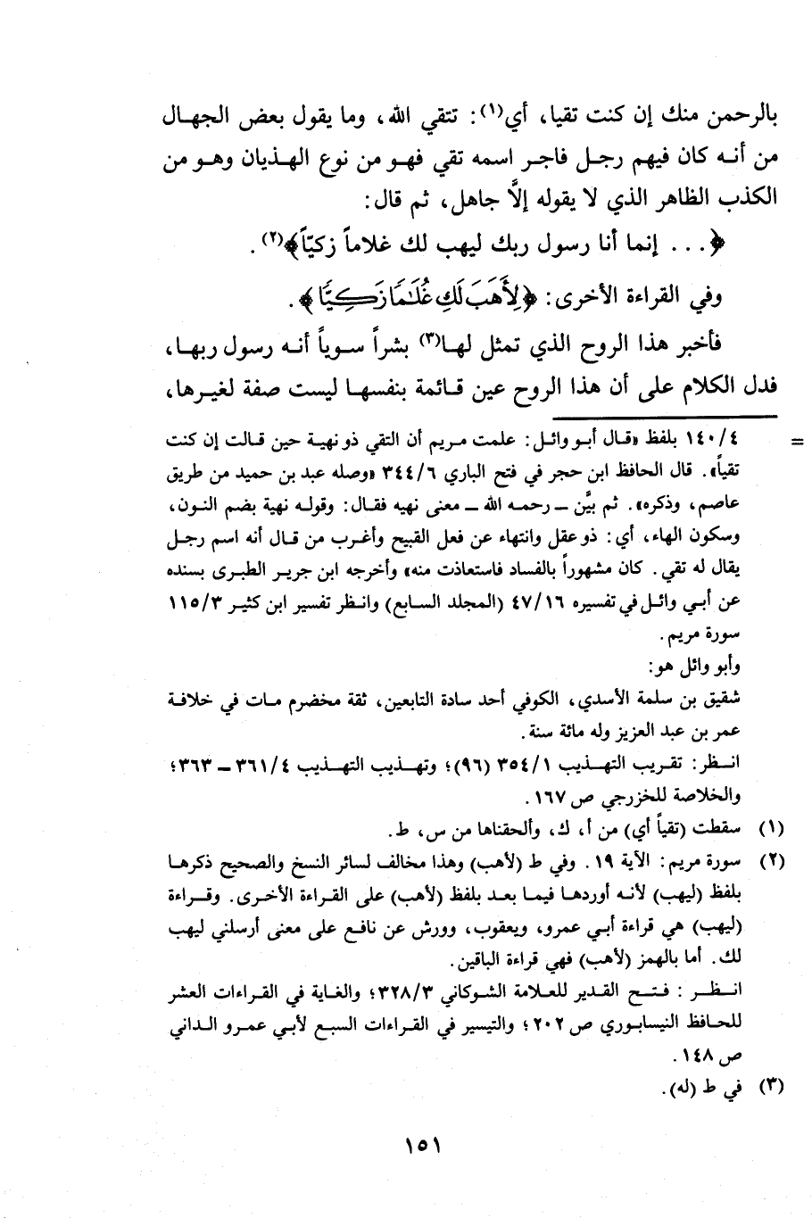 بِالرَّحْمَنِ مِنْكَ إِنْ كُنْتَ تَقِيًّا أَيْ تَتَّقِي اللَّهَ وَمَا يَقُولُ بَعْضُ الْجُهَّالِ مِنْ أَنَّهُ كَانَ فِيهِمْ رَجُلٌ فَاجِرٌ اسْمُهُ تَقِيٌّ فَهُوَ مِنْ نَوْعِ الْهَذَيَانِ وَهُوَ مِنَ الْكَذِبِ الظَّاهِرِ الَّذِي لَا يَقُولُهُ إِلَّا جَاهِلٌ ثُمَّ قَالَ إِنَّمَا أَنَا رَسُولُ رَبِّكِ لِأهَبَ لَكِ غُلَامًا زَكِيًّا وَفِي الْقِرَاءَةِ الْأُخْرَى {لِأَهَبَ لَكِ غُلَامًا زَكِيًّا} [مريم: 19] فَأَخْبَرَ هَذَا الرُّوحُ الَّذِي تَمَثَّلَ لَهَا بَشَرًا سَوِيًّا أَنَّهُ رَسُولُ رَبِّهَا فَدَلَّ الْكَلَامُ عَلَى أَنَّ هَذَا الرُّوحَ عَيْنٌ قَائِمَةٌ بِنَفْسِهَا لَيْسَتْ صِفَةً لِغَيْرِهَا
