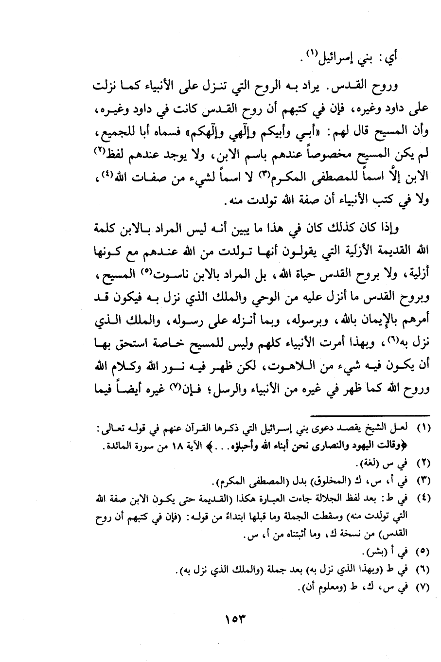 وَإِذَا كَانَ كَذَلِكَ كَانَ فِي هَذَا مَا يُبَيِّنُ أَنَّهُ لَيْسَ الْمُرَادُ بِالِابْنِ كَلِمَةَ اللَّهِ الْقَدِيمَةَ الْأَزَلِيَّةَ الَّتِي يَقُولُونَ أَنَّهَا تَوَلَّدَتْ مِنَ اللَّهِ عِنْدَهُمْ مَعَ كَوْنِهَا أَزَلِيَّةً وَلَا بِرُوحِ الْقُدُسِ حَيَاةُ اللَّهِ بَلِ الْمُرَادُ بِالِابْنِ نَاسُوتُ الْمَسِيحِ وَبِرُوحِ الْقُدُسِ مَا أُنْزِلَ عَلَيْهِ مِنَ الْوَحْيِ وَالْمَلَكِ الَّذِي نَزَلَ بِهِ، فَيَكُونُ قَدْ أَمَرَهُمْ بِالْإِيمَانِ بِاللَّهِ وَبِرَسُولِهِ وَبِمَا أَنْزَلَهُ عَلَى رَسُولِهِ وَالْمَلَكِ الَّذِي نَزَلَ بِهِ وَبِهَذَا أُمِرَتِ الْأَنْبِيَاءُ كُلُّهُمْ وَلَيْسَ لِلْمَسِيحِ خَاصَّةٌ اسْتَحَقَّ بِهَا أَنْ يَكُونَ فِيهِ شَيْءٌ مِنَ اللَّاهُوتِ لَكِنْ ظَهَرَ فِيهِ نُورُ اللَّهِ وَكَلَامُ اللَّهِ وَرُوحُ اللَّهِ كَمَا ظَهَرَ فِي غَيْرِهِ مِنَ الْأَنْبِيَاءِ وَالرُّسُلِ، فَإِنَّ غَيْرَهُ أَيْضًا فِيمَا