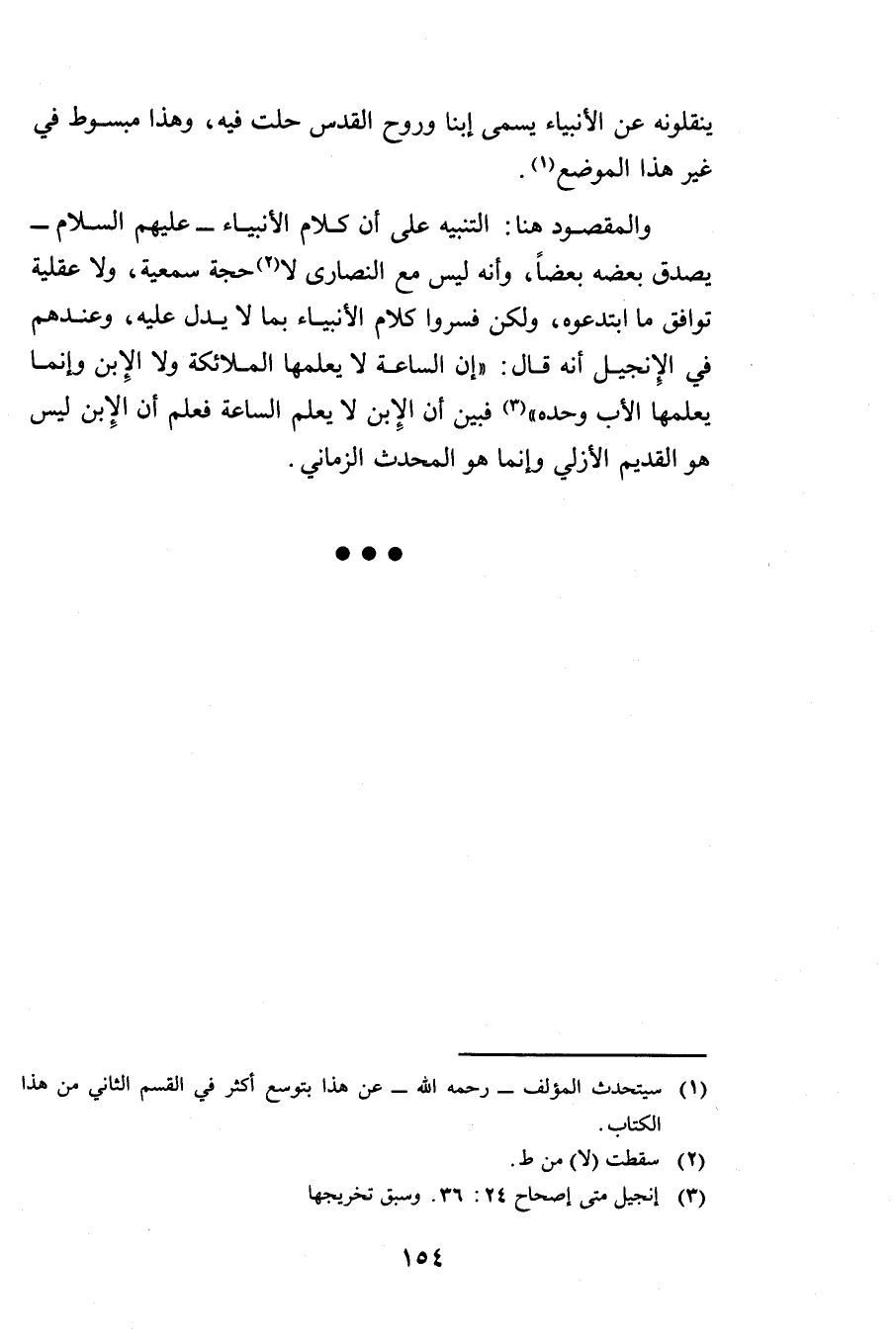 وَالْمَقْصُودُ هُنَا التَّنْبِيهُ عَلَى أَنَّ كَلَامَ الْأَنْبِيَاءِ - عَلَيْهِمُ السَّلَامُ - يُصَدِّقُ بَعْضُهُ بَعْضًا وَأَنَّهُ لَيْسَ مَعَ النَّصَارَى لَا حُجَّةٌ سَمْعِيَّةٌ وَلَا عَقْلِيَّةٌ تُوَافِقُ مَا ابْتَدَعُوهُ، وَلَكِنْ فَسَّرُوا كَلَامَ الْأَنْبِيَاءِ بِمَا لَا يَدُلُّ عَلَيْهِ وَعِنْدَهُمْ فِي الْإِنْجِيلِ أَنَّهُ قَالَ: إِنَّ السَّاعَةَ لَا يَعْلَمُهَا الْمَلَائِكَةُ وَلَا الِابْنُ وَإِنَّمَا يَعْلَمُهَا الْآبُ وَحْدَهُ فَبَيَّنَ أَنَّ الِابْنَ لَا يَعْلَمُ السَّاعَةَ فَعُلِمَ أَنَّ الِابْنَ لَيْسَ هُوَ الْقَدِيمُ الْأَزَلِيُّ وَإِنَّمَا هُوَ الْمُحْدَثُ الزَّمَانِيُّ.