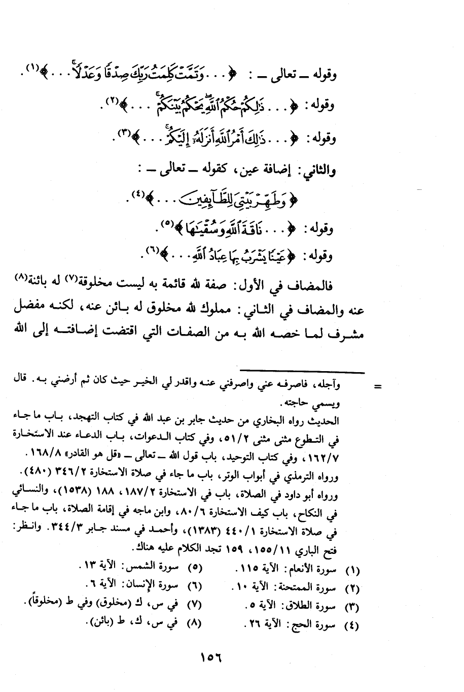 وَقَوْلِهِ - تَعَالَى -: {وَتَمَّتْ كَلِمَةُ رَبِّكَ صِدْقًا وَعَدْلًا} [الأنعام: 115] وَقَوْلِهِ: {ذَلِكُمْ حُكْمُ اللَّهِ يَحْكُمُ بَيْنَكُمْ} [الممتحنة: 10] وَقَوْلِهِ: {ذَلِكَ أَمْرُ اللَّهِ أَنْزَلَهُ إِلَيْكُمْ} [الطلاق: 5] وَالثَّانِي: إِضَافَةُ عَيْنٍ كَقَوْلِهِ - تَعَالَى -: {وَطَهِّرْ بَيْتِيَ لِلطَّائِفِينَ} [الحج: 26] وَقَوْلِهِ: {نَاقَةَ اللَّهِ وَسُقْيَاهَا} [الشمس: 13] وَقَوْلِهِ: {عَيْنًا يَشْرَبُ بِهَا عِبَادُ اللَّهِ} [الإنسان: 6] فَالْمُضَافُ فِي الْأَوَّلِ صِفَةٌ لِلَّهِ قَائِمَةٌ بِهِ لَيْسَتْ مَخْلُوقَةً لَهُ بَائِنَةً عَنْهُ وَالْمُضَافُ فِي الثَّانِي: مَمْلُوكٌ لِلَّهِ مَخْلُوقٌ لَهُ بَائِنٌ عَنْهُ لَكِنَّهُ مُفَضَّلٌ مُشَرَّفٌ لِمَا خَصَّهُ اللَّهُ بِهِ مِنَ الصِّفَاتِ الَّتِي اقْتَضَتْ إِضَافَتَهُ إِلَى اللَّهِ