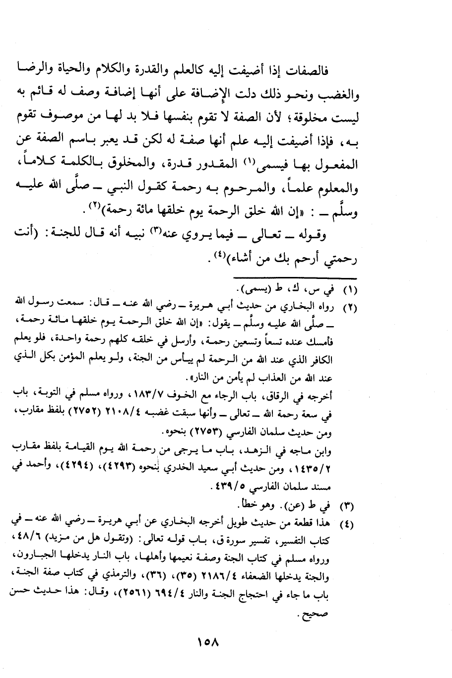 فَالصِّفَاتُ إِذَا أُضِيفَتْ إِلَيْهِ كَالْعِلْمِ وَالْقُدْرَةِ وَالْكَلَامِ وَالْحَيَاةِ وَالرِّضَا وَالْغَضَبِ وَنَحْوِ ذَلِكَ دَلَّتِ الْإِضَافَةُ عَلَى أَنَّهَا إِضَافَةُ وَصْفٍ لَهُ قَائِمٍ بِهِ لَيْسَتْ مَخْلُوقَةً ; لِأَنَّ الصِّفَةَ لَا تَقُومُ بِنَفْسِهَا فَلَا بُدَّ لَهَا مِنْ مَوْصُوفٍ تَقُومُ بِهِ فَإِذَا أُضِيفَتْ إِلَيْهِ عُلِمَ أَنَّهَا صِفَةٌ لَهُ لَكِنْ قَدْ يُعَبَّرُ بِاسْمِ الصِّفَةِ عَنِ الْمَفْعُولِ بِهَا فَيُسَمَّى الْمَقْدُورُ قُدْرَةً وَالْمَخْلُوقُ بِالْكَلِمَةِ كَلَامًا وَالْمَعْلُومُ عِلْمًا وَالْمَرْحُومُ بِهِ رَحْمَةً كَقَوْلِ النَّبِيِّ - صَلَّى اللَّهُ عَلَيْهِ وَسَلَّمَ - «إِنَّ اللَّهَ خَلَقَ الرَّحْمَةَ يَوْمَ خَلَقَهَا مِائَةَ رَحْمَةٍ» .