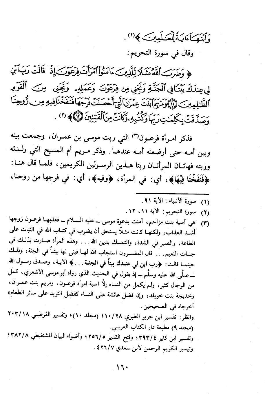 وَقَالَ فِي سُورَةِ التَّحْرِيمِ {وَضَرَبَ اللَّهُ مَثَلًا لِلَّذِينَ آمَنُوا اِمْرَأَةَ فِرْعَوْنَ إِذْ قَالَتْ رَبِّ ابْنِ لِي عِنْدَكَ بَيْتًا فِي الْجَنَّةِ وَنَجِّنِي مِنْ فِرْعَوْنَ وَعَمَلِهِ وَنَجِّنِي مِنَ الْقَوْمِ الظَّالِمِينَ} [التحريم: 11] (11) {وَمَرْيَمَ ابْنَتَ عِمْرَانَ الَّتِي أَحْصَنَتْ فَرْجَهَا فَنَفَخْنَا فِيهِ مِنْ رُوحِنَا وَصَدَّقَتْ بِكَلِمَاتِ رَبِّهَا وَكُتُبِهِ وَكَانَتْ مِنَ الْقَانِتِينَ} [التحريم: 12] فَذَكَرَ امْرَأَةَ فِرْعَوْنَ الَّتِي رَبَّتْ مُوسَى بْنَ عِمْرَانَ وَجَمَعَتْ بَيْنَهُ وَبَيْنَ أُمِّهِ حَتَّى أَرْضَعَتْهُ أُمُّهُ عِنْدَهَا وَذَكَرَ مَرْيَمَ أُمَّ الْمَسِيحِ الَّتِي وَلَدَتْهُ وَرَبَّتْهُ فَهَاتَانِ الْمَرْأَتَانِ رَبَّتَا هَذَيْنِ الرَّسُولَيْنِ الْكَرِيمَيْنِ فَلَمَّا قَالَ هُنَا {فَنَفَخْنَا فِيهَا} [الأنبياء: 91] أَيْ فِي الْمَرْأَةِ وَفِيهِ أَيْ فِي فَرْجِهَا مِنْ رُوحِنَا