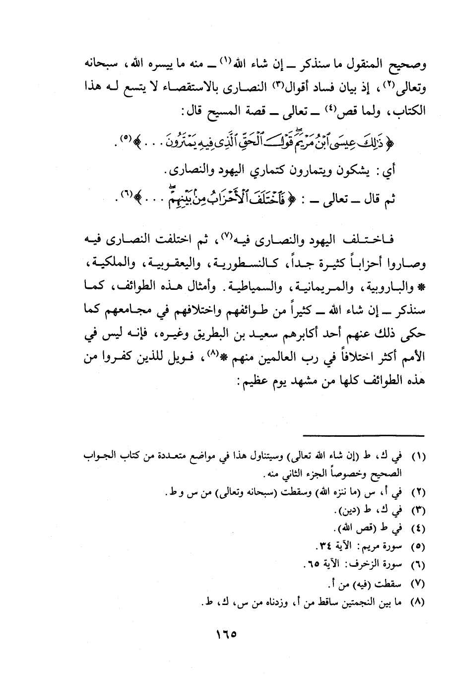 وَصَحِيحِ الْمَنْقُولِ مَا سَنَذْكُرُ - إِنْ شَاءَ اللَّهُ - مِنْهُ مَا يُيَسِّرُهُ اللَّهُ - سُبْحَانَهُ وَتَعَالَى - إِذْ بَيَانُ فَسَادِ أَقْوَالِ النَّصَارَى بِالِاسْتِقْصَاءِ لَا يَتَّسِعُ لَهُ هَذَا الْكِتَابُ وَلَمَّا قَصَّ - تَعَالَى - قِصَّةَ الْمَسِيحِ قَالَ {ذَلِكَ عِيسَى ابْنُ مَرْيَمَ قَوْلَ الْحَقِّ} [مريم: 34] أَيْ يَشُكُّونَ وَيَتَمَارَوْنَ كَتَمَارِي الْيَهُودِ وَالنَّصَارَى.