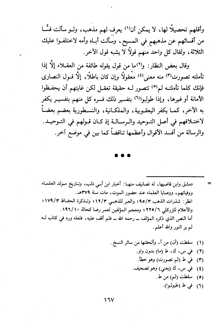 وَأَقَلُّهُمْ تَحْصِيلًا لَهَا لَا يُمْكِنُ أَنْ يُعْرَفَ لَهُمْ مَذْهَبٌ وَلَوْ سَأَلْتَ قَسًّا مِنْ أَقْسَائِهِمْ عَنْ مَذْهَبِهِمْ فِي الْمَسِيحِ وَسَأَلْتَ أَبَاهُ وَأُمَّهُ لَاخْتَلَفُوا عَلَيْكَ الثَّلَاثَةُ وَلَقَالَ كُلُّ وَاحِدٍ مِنْهُمْ قَوْلًا لَا يُشْبِهُ قَوْلَ الْآخَرِ.