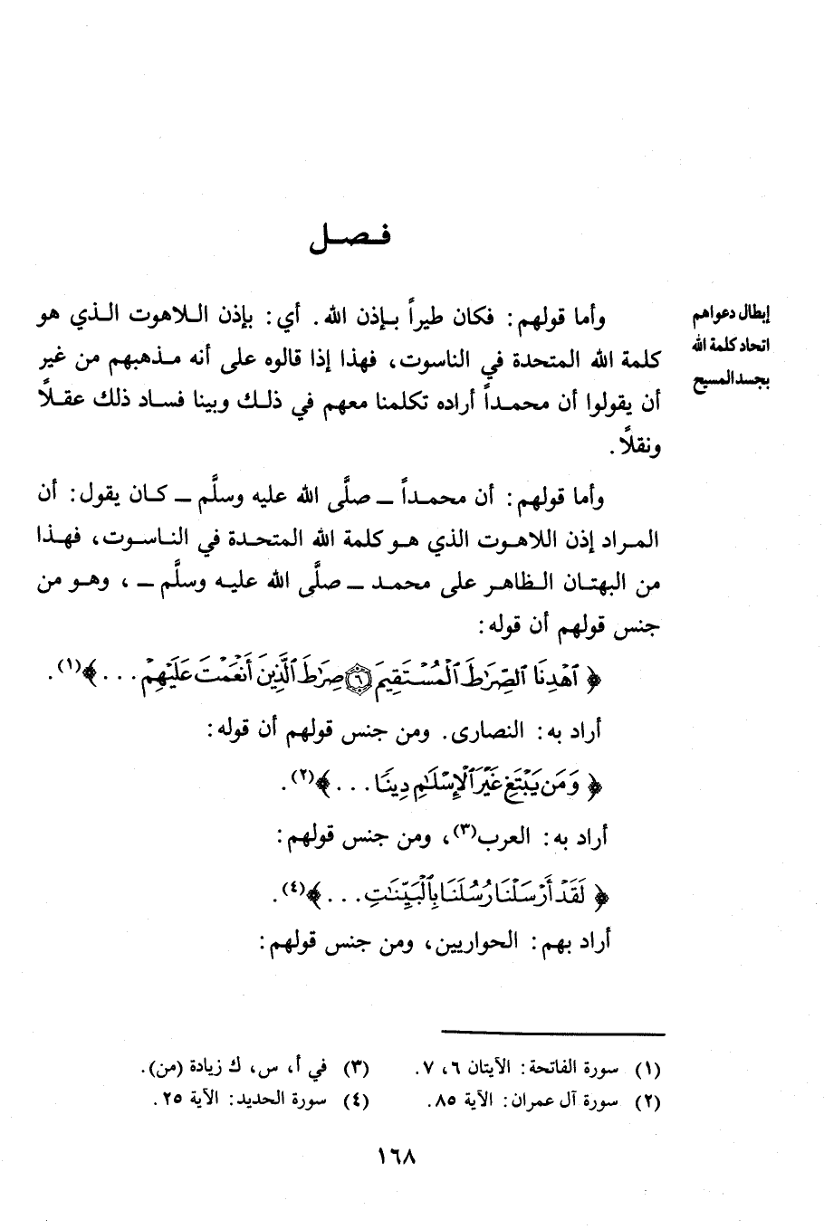 وَأَمَّا قَوْلُهُمْ: أَنَّ مُحَمَّدًا - صَلَّى اللَّهُ عَلَيْهِ وَسَلَّمَ - كَانَ يَقُولُ: أَنَّ الْمُرَادَ إِذْنَ اللَّاهُوتِ الَّذِي هُوَ كَلِمَةُ اللَّهِ الْمُتَّحِدَةُ فِي النَّاسُوتِ فَهَذَا مِنَ الْبُهْتَانِ الظَّاهِرِ عَلَى مُحَمَّدٍ - صَلَّى اللَّهُ عَلَيْهِ وَسَلَّمَ - وَهُوَ مِنْ جِنْسِ قَوْلِهِمْ أَنَّ قَوْلَهُ: {اهْدِنَا الصِّرَاطَ الْمُسْتَقِيمَ صِرَاطَ الَّذِينَ أَنْعَمْتَ عَلَيْهِمْ} [الفاتحة: 6] أَرَادَ بِهِ النَّصَارَى وَمِنْ جِنْسِ قَوْلِهِمْ أَنَّ قَوْلَهُ: {وَمَنْ يَبْتَغِ غَيْرَ الْإِسْلَامِ دِينًا} [آل عمران: 85] أَرَادَ بِهِ الْعَرَبَ وَمِنْ جِنْسِ قَوْلِهِمْ {لَقَدْ أَرْسَلْنَا رُسُلَنَا بِالْبَيِّنَاتِ} [الحديد: 25] أَرَادَ بِهِمُ الْحَوَارِيِّينَ وَمِنْ جِنْسِ قَوْلِهِمْ
