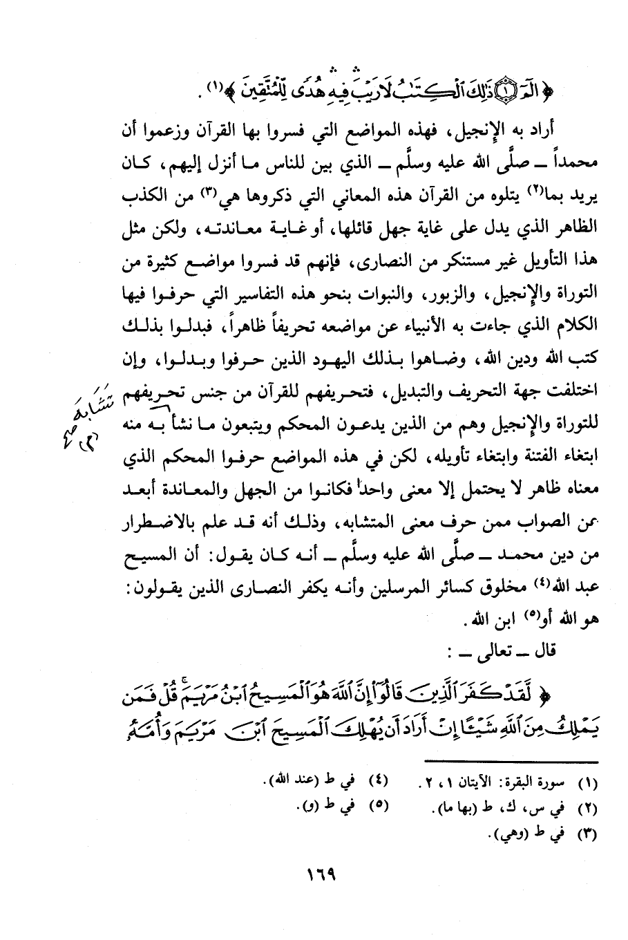 {الم ذَلِكَ الْكِتَابُ لَا رَيْبَ فِيهِ هُدًى لِلْمُتَّقِينَ} [البقرة: 1] أَرَادَ بِهِ الْإِنْجِيلَ فَهَذِهِ الْمَوَاضِعُ الَّتِي فَسَّرُوا بِهَا الْقُرْآنَ وَزَعَمُوا أَنَّ مُحَمَّدًا - صَلَّى اللَّهُ عَلَيْهِ وَسَلَّمَ - الَّذِي بَيَّنَ لِلنَّاسِ مَا أُنْزِلَ إِلَيْهِمْ كَانَ يُرِيدُ بِمَا يَتْلُوهُ مِنَ الْقُرْآنِ هَذِهِ الْمَعَانِي الَّتِي ذَكَرُوهَا هِيَ مِنَ الْكَذِبِ الظَّاهِرِ الَّذِي يَدُلُّ عَلَى غَايَةِ جَهْلِ قَائِلِهَا أَوْ غَايَةِ مُعَانَدَتِهِ، وَلَكِنَّ مِثْلَ هَذَا التَّأْوِيلِ غَيْرُ مُسْتَنْكَرٍ مِنَ النَّصَارَى، فَإِنَّهُمْ قَدْ فَسَّرُوا مَوَاضِعَ كَثِيرَةً مِنَ التَّوْرَاةِ وَالْإِنْجِيلِ وَالزَّبُورِ وَالنُّبُوَّاتِ بِنَحْوِ هَذِهِ التَّفَاسِيرِ الَّتِي حَرَّفُوا فِيهَا الْكَلَامَ الَّذِي جَاءَتْ بِهِ الْأَنْبِيَاءُ عَنْ مَوَاضِعِهِ تَحْرِيفًا ظَاهِرًا فَبَدَّلُوا بِذَلِكَ كُتُبَ اللَّهِ وَدِينَ اللَّهِ وَضَاهَوْا بِذَلِكَ الْيَهُودَ الَّذِينَ حَرَّفُوا وَبَدَّلُوا وَإِنِ اخْتَلَفَتْ جِهَةُ التَّحْرِيفِ وَالتَّبْدِيلِ فَتَحْرِيفُهُمْ لِلْقُرْآنِ مِنْ جِنْسِ تَحْرِيفِهِمْ لِلتَّوْرَاةِ وَالْإِنْجِيلِ وَهُمْ مِنَ الَّذِينَ يَدَّعُونَ الْمُحْكَمَ وَيَتَّبِعُونَ مَا نَشَأَ بِهِ مِنْهُ ابْتِغَاءَ الْفِتْنَةِ وَابْتِغَاءَ تَأْوِيلِهِ لَكِنْ فِي هَذِهِ الْمَوَاضِعِ حَرَّفُوا الْمُحْكَمَ الَّذِي مَعْنَاهُ ظَاهِرٌ لَا يَحْتَمِلُ إِلَّا مَعْنًى وَاحِدٌ فَكَانُوا مِنَ الْجَهْلِ وَالْمُعَانَدَةِ أَبْعَدَ عَنِ الصَّوَابِ مِمَّنْ حَرَّفَ مَعْنَى الْمُتَشَابِهِ وَذَلِكَ أَنَّهُ قَدْ عُلِمَ بِالِاضْطِرَارِ مِنْ دِينِ مُحَمَّدٍ - صَلَّى اللَّهُ عَلَيْهِ وَسَلَّمَ - أَنَّهُ كَانَ يَقُولُ أَنَّ الْمَسِيحَ عَبْدُ اللَّهِ مَخْلُوقٌ كَسَائِرِ الْمُرْسَلِينَ وَأَنَّهُ يُكَفِّرُ النَّصَارَى الَّذِينَ يَقُولُونَ هُوَ اللَّهُ أَوِ ابْنُ اللَّهِ.