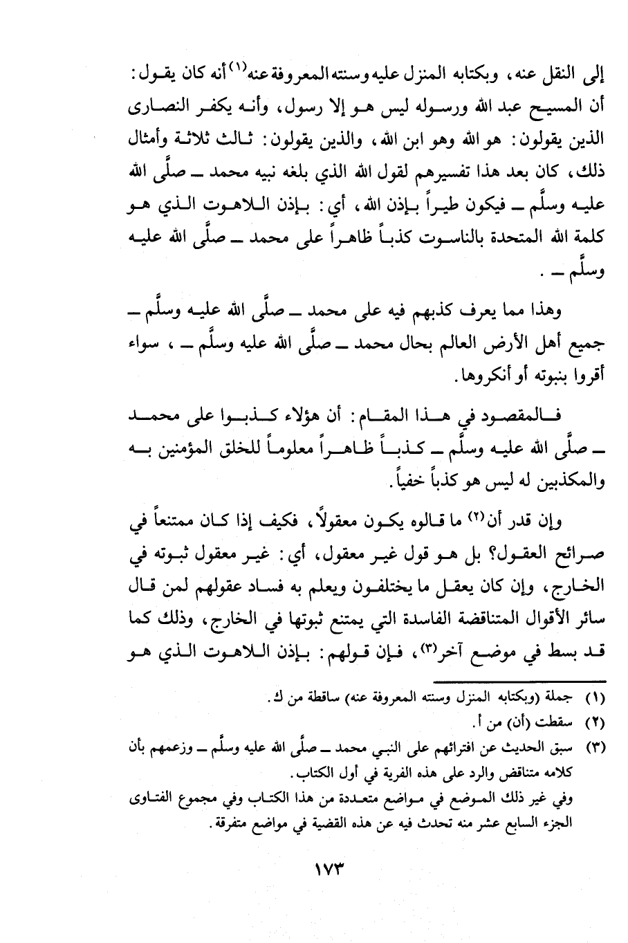 إِلَى النَّقْلِ عَنْهُ وَبِكِتَابِهِ الْمُنَزَّلِ عَلَيْهِ وَسُنَّتِهِ الْمَعْرُوفَةِ عَنْهُ أَنَّهُ كَانَ يَقُولُ أَنَّ الْمَسِيحَ عَبْدُ اللَّهِ وَرَسُولُهُ لَيْسَ هُوَ إِلَّا رَسُولٌ وَأَنَّهُ يُكَفِّرُ النَّصَارَى الَّذِينَ يَقُولُونَ هُوَ اللَّهُ وَهُوَ ابْنُ اللَّهِ وَالَّذِينَ يَقُولُونَ ثَالِثَ ثَلَاثَةٍ وَأَمْثَالَ ذَلِكَ كَانَ بَعْدَ هَذَا تَفْسِيرُهُمْ لِقَوْلِ اللَّهِ الَّذِي بَلَّغَهُ نَبِيُّهُ مُحَمَّدٌ - صَلَّى اللَّهُ عَلَيْهِ وَسَلَّمَ - فَيَكُونُ طَيْرًا بِإِذْنِ اللَّهِ أَيْ بِإِذْنِ اللَّاهُوتِ الَّذِي هُوَ كَلِمَةُ اللَّهِ الْمُتَّحِدَةُ بِالنَّاسُوتِ كَذِبًا ظَاهِرًا عَلَى مُحَمَّدٍ - صَلَّى اللَّهُ عَلَيْهِ وَسَلَّمَ.