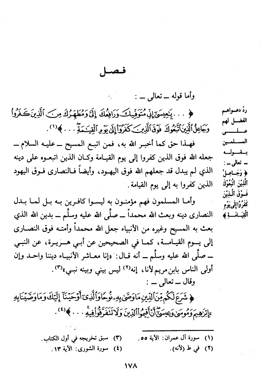 وَأَمَّا قَوْلُهُ - تَعَالَى -: {يَا عِيسَى إِنِّي مُتَوَفِّيكَ وَرَافِعُكَ إِلَيَّ وَمُطَهِّرُكَ مِنَ الَّذِينَ كَفَرُوا وَجَاعِلُ الَّذِينَ اتَّبَعُوكَ فَوْقَ الَّذِينَ كَفَرُوا إِلَى يَوْمِ الْقِيَامَةِ} [آل عمران: 55] فَهَذَا حَقٌّ كَمَا أَخْبَرَ اللَّهُ بِهِ فَمَنِ اتَّبَعَ الْمَسِيحَ - عَلَيْهِ السَّلَامُ - جَعَلَهُ اللَّهُ فَوْقَ الَّذِينَ كَفَرُوا إِلَى يَوْمِ الْقِيَامَةِ وَكَانَ الَّذِينَ اتَّبَعُوهُ عَلَى دِينِهِ الَّذِي لَمْ يُبَدَّلْ قَدْ جَعَلَهُمُ اللَّهُ فَوْقَ الْيَهُودِ وَأَيْضًا فَالنَّصَارَى فَوْقَ الْيَهُودِ الَّذِينَ كَفَرُوا بِهِ إِلَى يَوْمِ الْقِيَامَةِ.