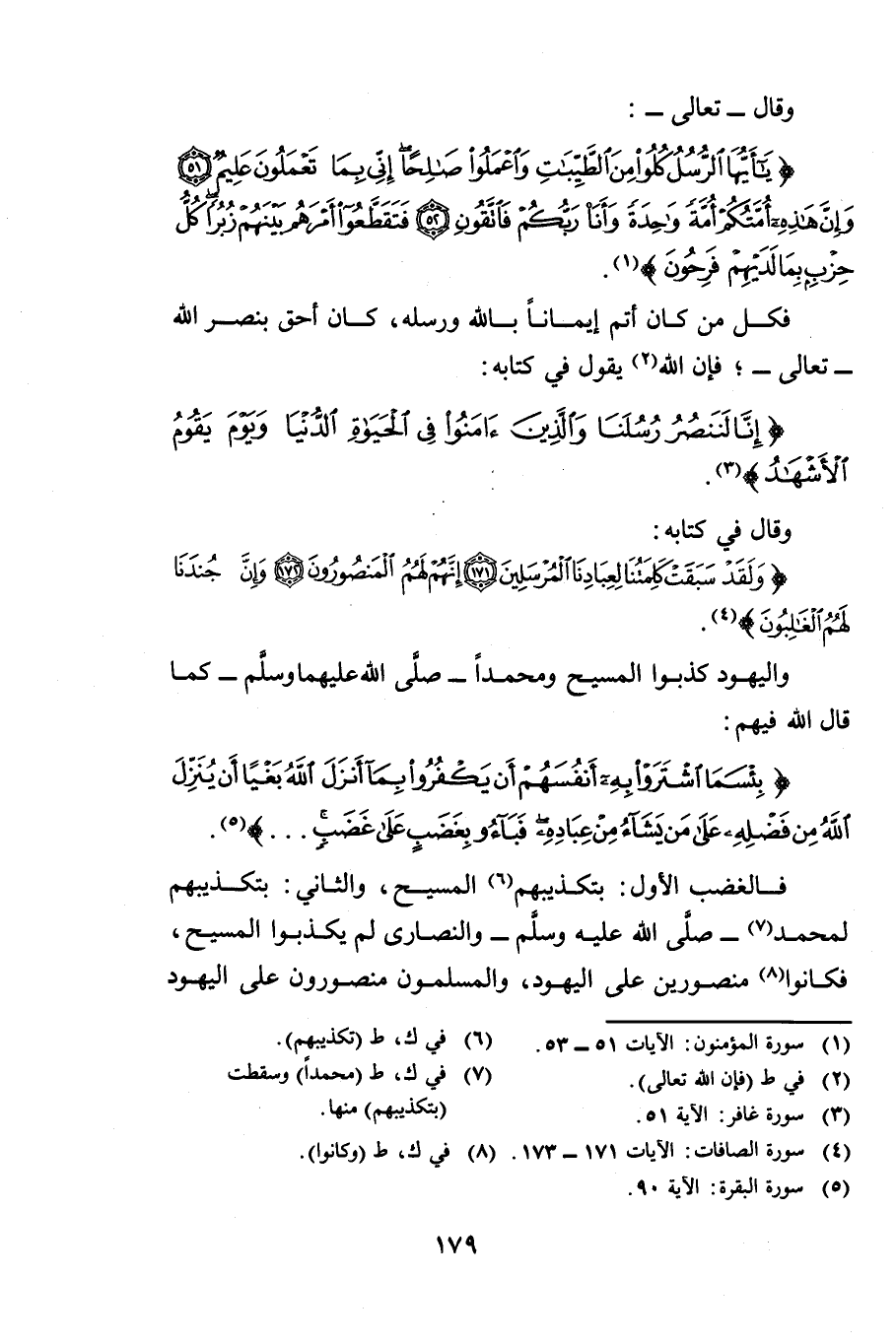 وَقَالَ - تَعَالَى -: {يَاأَيُّهَا الرُّسُلُ كُلُوا مِنَ الطَّيِّبَاتِ وَاعْمَلُوا صَالِحًا إِنِّي بِمَا تَعْمَلُونَ عَلِيمٌ وَإِنَّ هَذِهِ أُمَّتُكُمْ أُمَّةً وَاحِدَةً وَأَنَا رَبُّكُمْ فَاتَّقُونِ} [المؤمنون: 51] (52) {فَتَقَطَّعُوا أَمْرَهُمْ بَيْنَهُمْ زُبُرًا كُلُّ حِزْبٍ بِمَا لَدَيْهِمْ فَرِحُونَ} [المؤمنون: 53] فَكُلُّ مَنْ كَانَ أَتَمَّ إِيمَانًا بِاللَّهِ وَرُسُلِهِ كَانَ أَحَقَّ بِنْصِرِ اللَّهِ تَعَالَى، فَإِنَّ اللَّهَ يَقُولُ فِي كِتَابِهِ {إِنَّا لَنَنْصُرُ رُسُلَنَا وَالَّذِينَ آمَنُوا فِي الْحَيَاةِ الدُّنْيَا وَيَوْمَ يَقُومُ الْأَشْهَادُ} [غافر: 51] وَقَالَ: فِي كِتَابِهِ {وَلَقَدْ سَبَقَتْ كَلِمَتُنَا لِعِبَادِنَا الْمُرْسَلِينَ} [الصافات: 171] (171) {إِنَّهُمْ لَهُمُ الْمَنْصُورُونَ} [الصافات: 172] (172) {وَإِنَّ جُنْدَنَا لَهُمُ الْغَالِبُونَ} [الصافات: 173] وَالْيَهُودُ كَذَّبُوا الْمَسِيحَ وَمُحَمَّدًا - صَلَّى اللَّهُ عَلَيْهِ وَسَلَّمَ - كَمَا قَالَ اللَّهُ فِيهِمْ {بِئْسَمَا اشْتَرَوْا بِهِ أَنْفُسَهُمْ أَنْ يَكْفُرُوا بِمَا أَنْزَلَ اللَّهُ بَغْيًا أَنْ يُنَزِّلَ اللَّهُ مِنْ فَضْلِهِ عَلَى مَنْ يَشَاءُ مِنْ عِبَادِهِ فَبَاءُوا بِغَضَبٍ} [البقرة: 90] فَالْغَضَبُ الْأَوَّلُ بِتَكْذِيبِهِمُ الْمَسِيحَ وَالثَّانِي: بِتَكْذِيبِهِمْ لِمُحَمَّدٍ - صَلَّى اللَّهُ عَلَيْهِ وَسَلَّمَ - وَالنَّصَارَى لَمْ يُكَذِّبُوا الْمَسِيحَ فَكَانُوا مَنْصُورِينَ عَلَى الْيَهُودِ وَالْمُسْلِمُونَ مَنْصُورُونَ عَلَى الْيَهُودِ