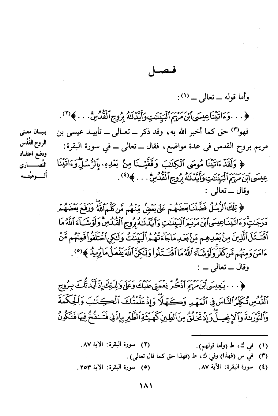 وَأَمَّا قَوْلُهُ - تَعَالَى -: {وَآتَيْنَا عِيسَى ابْنَ مَرْيَمَ الْبَيِّنَاتِ وَأَيَّدْنَاهُ بِرُوحِ الْقُدُسِ} [البقرة: 87] فَهُوَ حَقٌّ كَمَا أَخْبَرَ اللَّهُ بِهِ وَقَدْ ذَكَرَ تَعَالَى تَأْيِيدَ عِيسَى ابْنِ مَرْيَمَ بِرُوحِ الْقُدُسِ فِي عِدَّةِ مَوَاضِعَ فَقَالَ - تَعَالَى - فِي سُورَةِ الْبَقَرَةِ {وَلَقَدْ آتَيْنَا مُوسَى الْكِتَابَ وَقَفَّيْنَا مِنْ بَعْدِهِ بِالرُّسُلِ وَآتَيْنَا عِيسَى ابْنَ مَرْيَمَ الْبَيِّنَاتِ وَأَيَّدْنَاهُ بِرُوحِ الْقُدُسِ} [البقرة: 87] وَقَالَ - تَعَالَى -: {تِلْكَ الرُّسُلُ فَضَّلْنَا بَعْضَهُمْ عَلَى بَعْضٍ مِنْهُمْ مَنْ كَلَّمَ اللَّهُ وَرَفَعَ بَعْضَهُمْ دَرَجَاتٍ وَآتَيْنَا عِيسَى ابْنَ مَرْيَمَ الْبَيِّنَاتِ وَأَيَّدْنَاهُ بِرُوحِ الْقُدُسِ وَلَوْ شَاءَ اللَّهُ مَا اقْتَتَلَ الَّذِينَ مِنْ بَعْدِهِمْ مِنْ بَعْدِ مَا جَاءَتْهُمُ الْبَيِّنَاتُ وَلَكِنِ اخْتَلَفُوا فَمِنْهُمْ مَنْ آمَنَ وَمِنْهُمْ مَنْ كَفَرَ وَلَوْ شَاءَ اللَّهُ مَا اقْتَتَلُوا وَلَكِنَّ اللَّهَ يَفْعَلُ مَا يُرِيدُ} [البقرة: 253] وَقَالَ - تَعَالَى -: {يَاعِيسَى ابْنَ مَرْيَمَ اذْكُرْ نِعْمَتِي عَلَيْكَ وَعَلى وَالِدَتِكَ إِذْ أَيَّدْتُكَ بِرُوحِ الْقُدُسِ تُكَلِّمُ النَّاسَ فِي الْمَهْدِ وَكَهْلًا وَإِذْ عَلَّمْتُكَ الْكِتَابَ وَالْحِكْمَةَ وَالتَّوْرَاةَ وَالْإِنْجِيلَ وَإِذْ تَخْلُقُ مِنَ الطِّينِ كَهَيْئَةِ الطَّيْرِ بِإِذْنِي فَتَنْفُخُ فِيهَا فَتَكُونُ طَيْرًا بِإِذْنِي وَتُبْرِئُ الْأَكْمَهَ وَالْأَبْرَصَ بِإِذْنِي} [المائدة: 110]